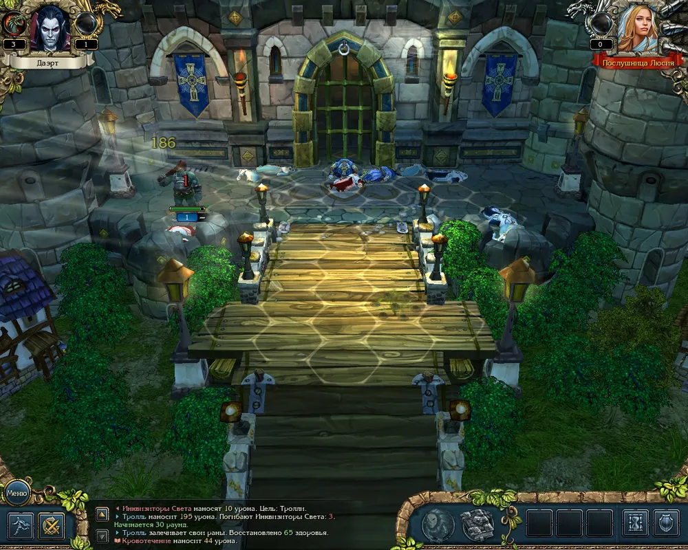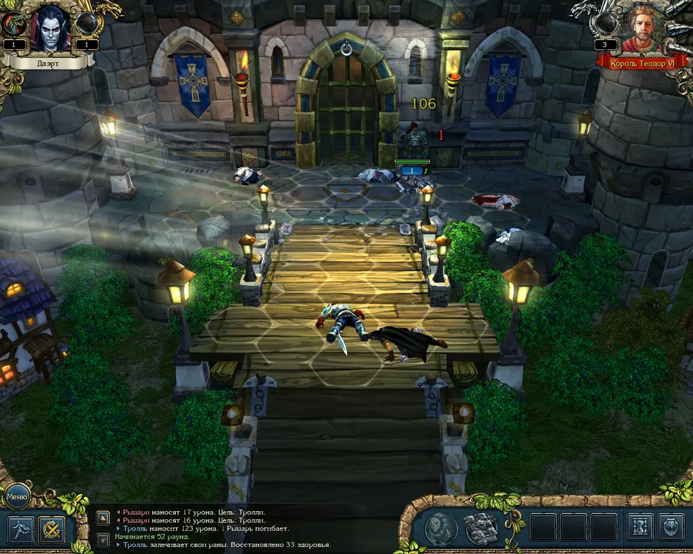 Возвращаемся в Портланд, убираем всех своих воинов и выбиваем из свитка "Рождение Гиганта" тролля, говорим с мальчиком Джимом неподалеку от замка, получаем задание на уничтожение пирата Черного Кота, выясняем его местонахождение в трактире "Подзорная труба" и дожидаемся вечера, чтобы тролль начал регенерировать. Один тролль изменил картину кардинально. Ни Баярд ни Черный Кот ничего не смогли с ним сделать. Пора наведаться и к дракону. Вот с ним надо поаккуратней, может и убить. Впрочем с этим также больших трудностей не возникло. Наведываемся в замок, берем задание у принцессы превратить двух дам в жаб, дурим принцессу притащив ей пару обычных лягушек и вместо денег тащим ее к дракону.