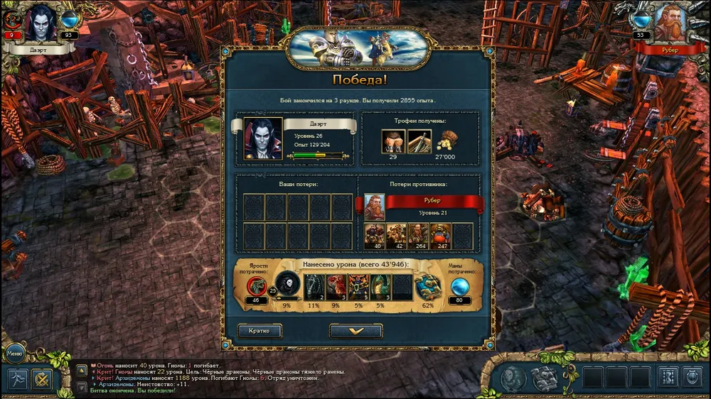 Тули Робкий умудрился сделать испуг и карлик на один из своих отрядов шахтеров (!!!), когда они были под воздействием статуи ревности. Ну а дальше уже все шло по накатанной - игра в догонялки, 4 моих отряда набрасывались на одного противника, а затем расходились по краям поля боя.