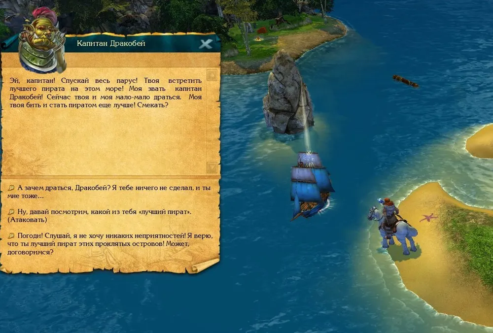 Прежде, чем отправляться к ним, сохраните игру в отдельный слот: не исключён вариант, что сразу после прибытия вас будет ожидать «торжественная» встреча в виде нескольких пиратских кораблей.