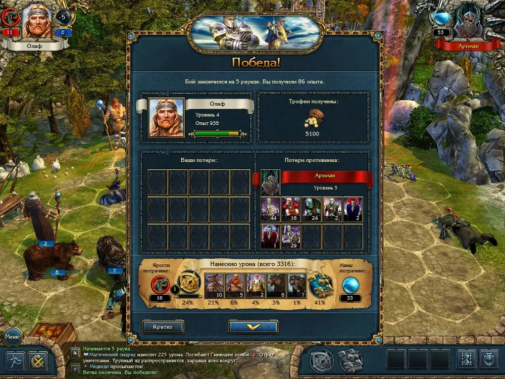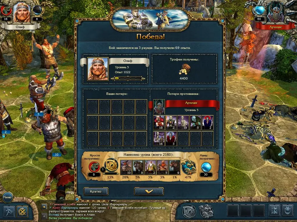 Но вот уничтожены все противники (кроме пары «непобедимых» отрядов), добыты кнуты, и мы идём на встречу с Ариманом. Сюрприз! Его войско имеет такую численность, что нечего и думать справиться без потерь. Придётся начинать сначала…