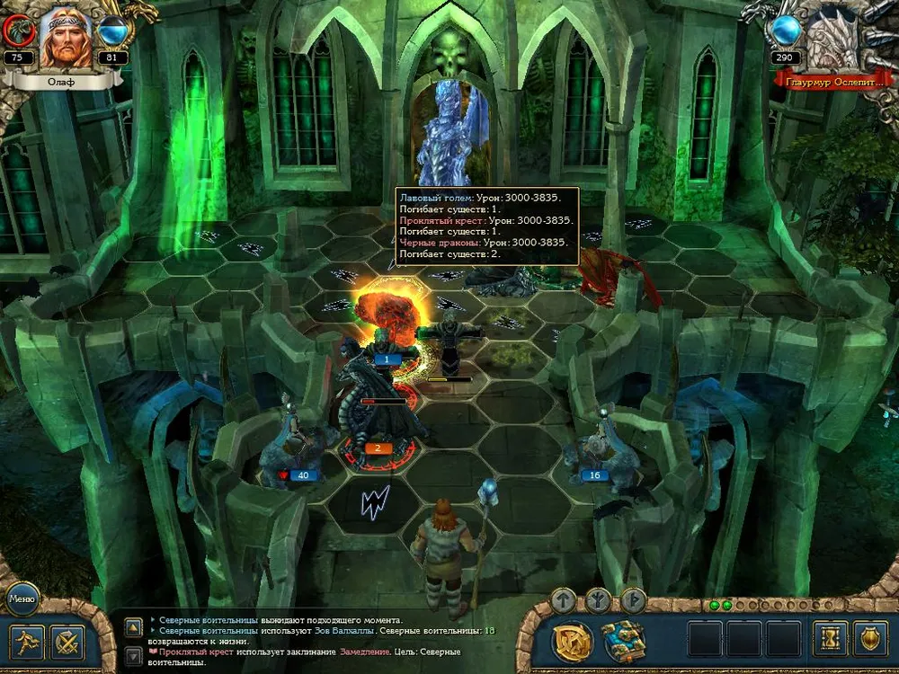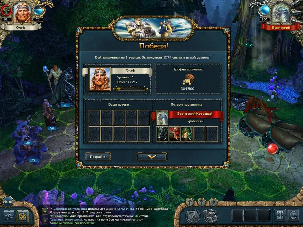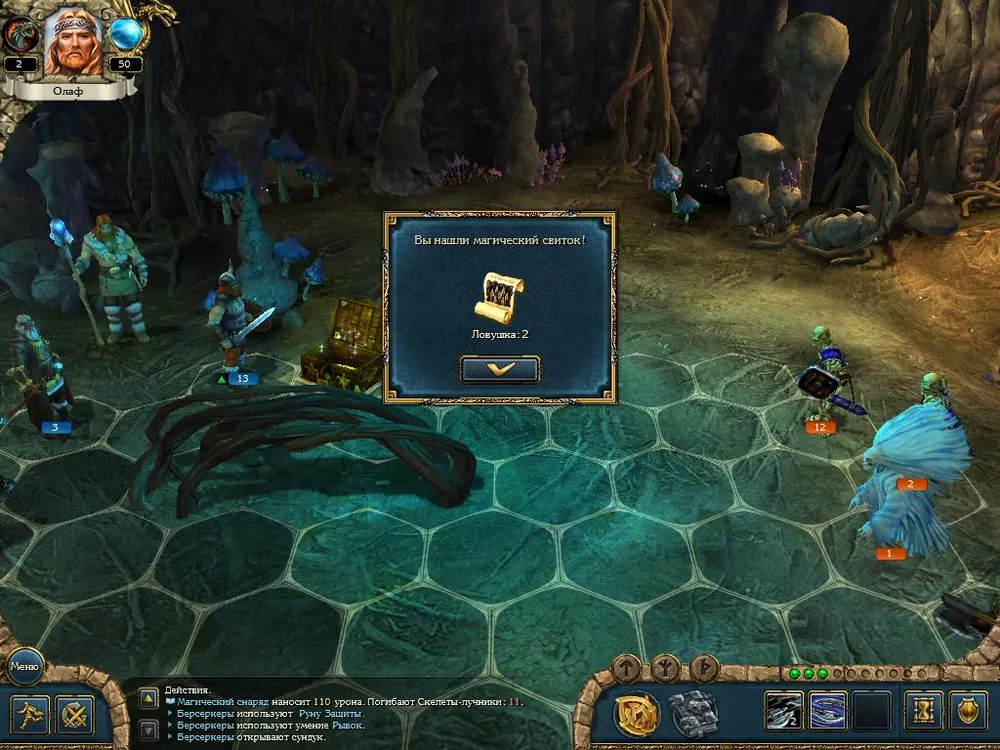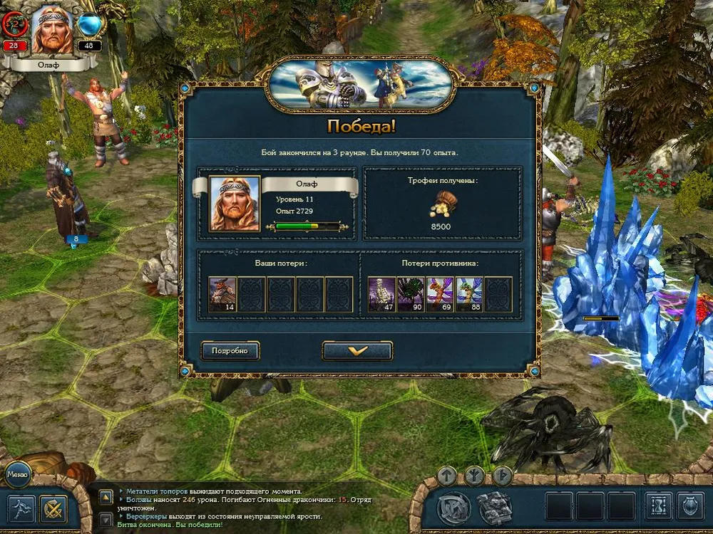 Что касается последующего боя с волхвом, то он также прошёл без потерь — помогли спецатаки валькирий. К слову, наибольшую пользу принесли «Ярость Гудриды» и «Стрелы Хильды». Чтобы оставить их умения на приемлемом уровне, я старался повышать «Дар Кристы», как наименее ценный. Из умений мага больше всего пригодилось наиболее доступное «Личное участие» и «Ледяные клинки», не дававшие противнику взять сундук и не оставляющие врагу другого пути, кроме как через ловушку.