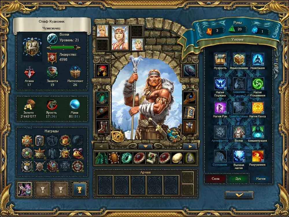 Вернувшись с подкреплением, оставляем воительниц в замке Кронберг и комплектуем войско следующим образом: в центре – отряд волхвов, по краям – четыре отряда по одному архимагу в каждом. (Очень полезно к этому моменту иметь хотя бы один уровень «Натиска» и заклинание «Ледяные шипы») Только по одному архимагу для того, чтобы войско не было слишком сильным и зарабатывало больше опыта. Архимаги почти не принимают участия в боях: их главная задача – получить орден «Хранитель» третьей степени; дополнительная защита ещё никому не мешала.
