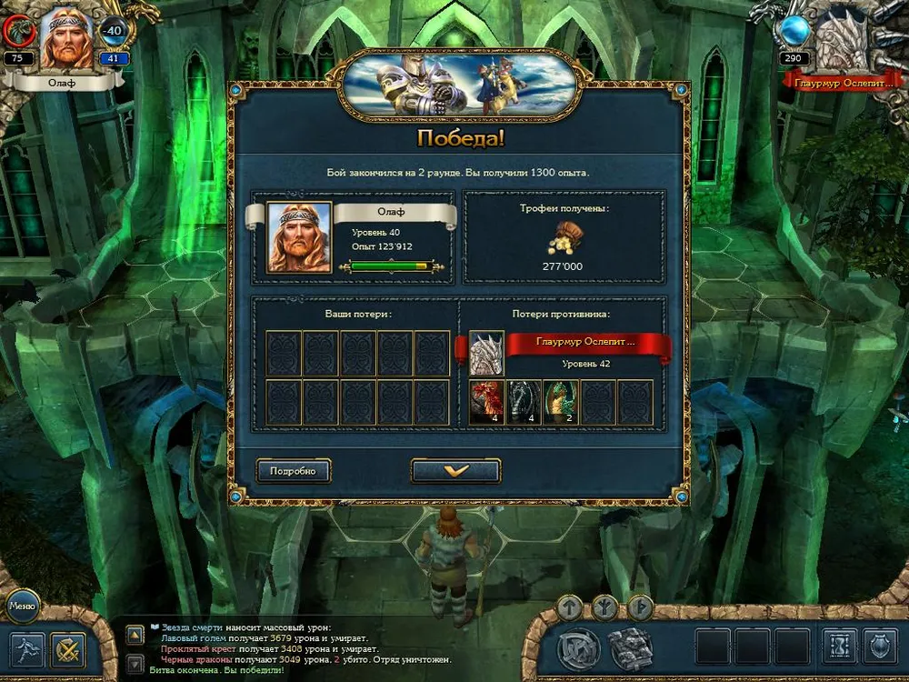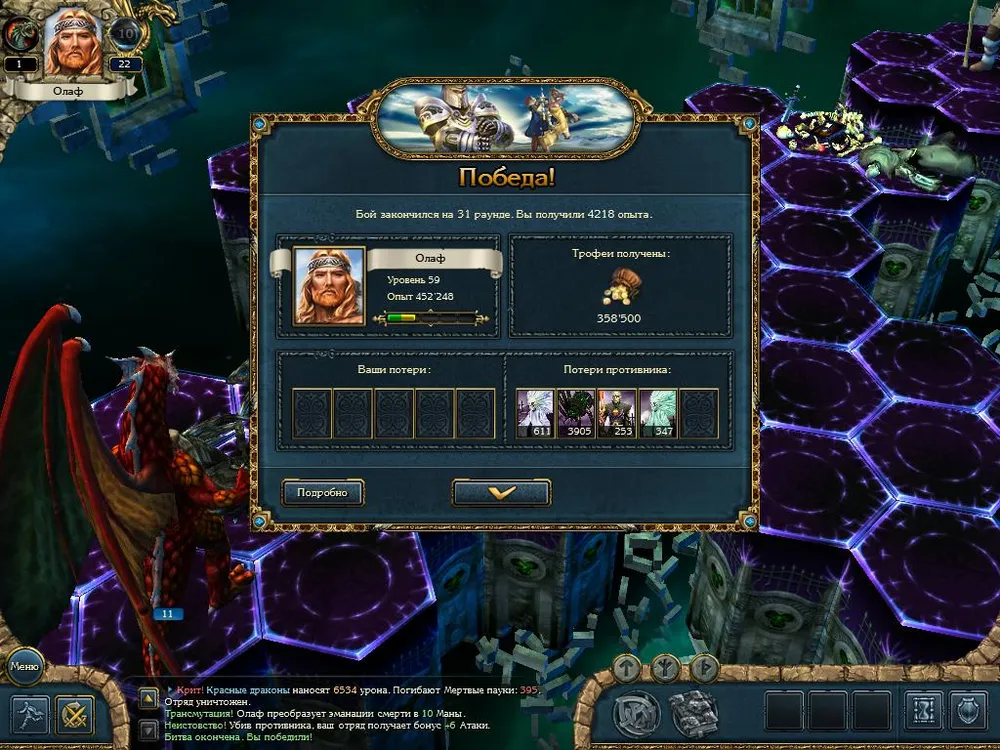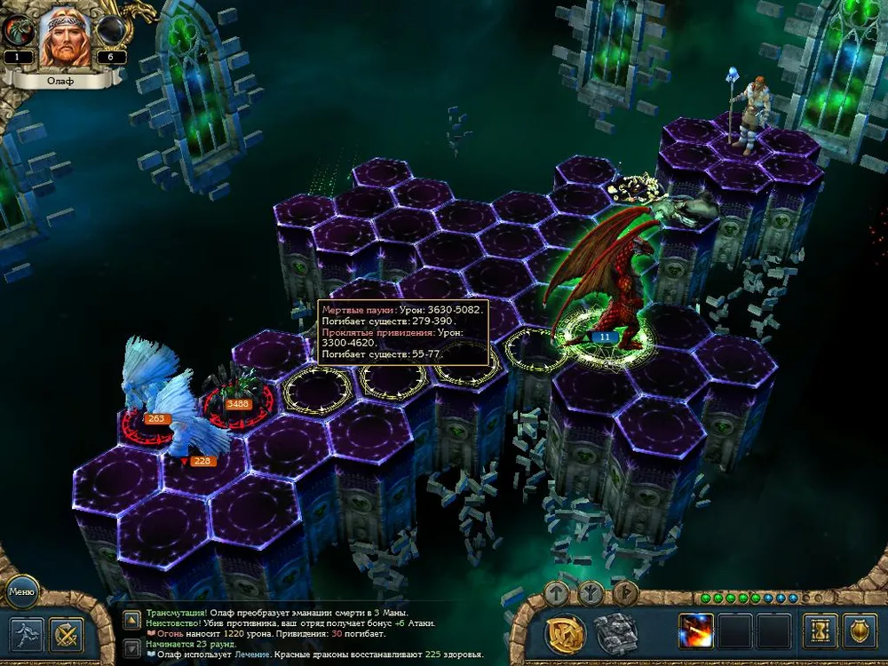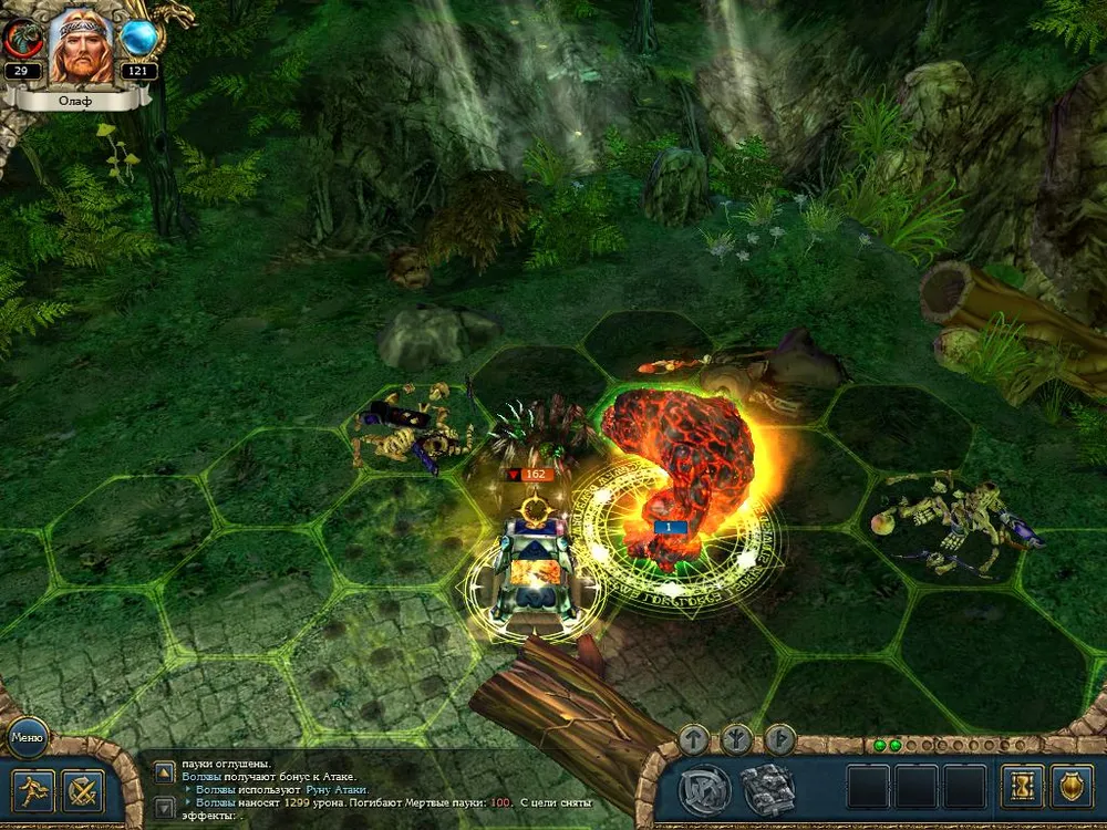 Как бы там ни было, я отправился в бой с войском, состоящим их трёх троллей и получил патовую ситуацию: малые пауки не могли убить троллей, регенерировавших после каждого хода, но и тролли не могли убить босса! Потеряв две трети здоровья от «Огненной стрелы», коварный паук начал раз за разом применять свою паутину, лишая троллей хода и не давая возможности применить заклинание. Ситуация моментально изменилась, стоило разделить войско на три отряда: тролли не атаковали, уходя в защиту и нанося лишь ответные удары. До той поры, пока босс не был уничтожен.