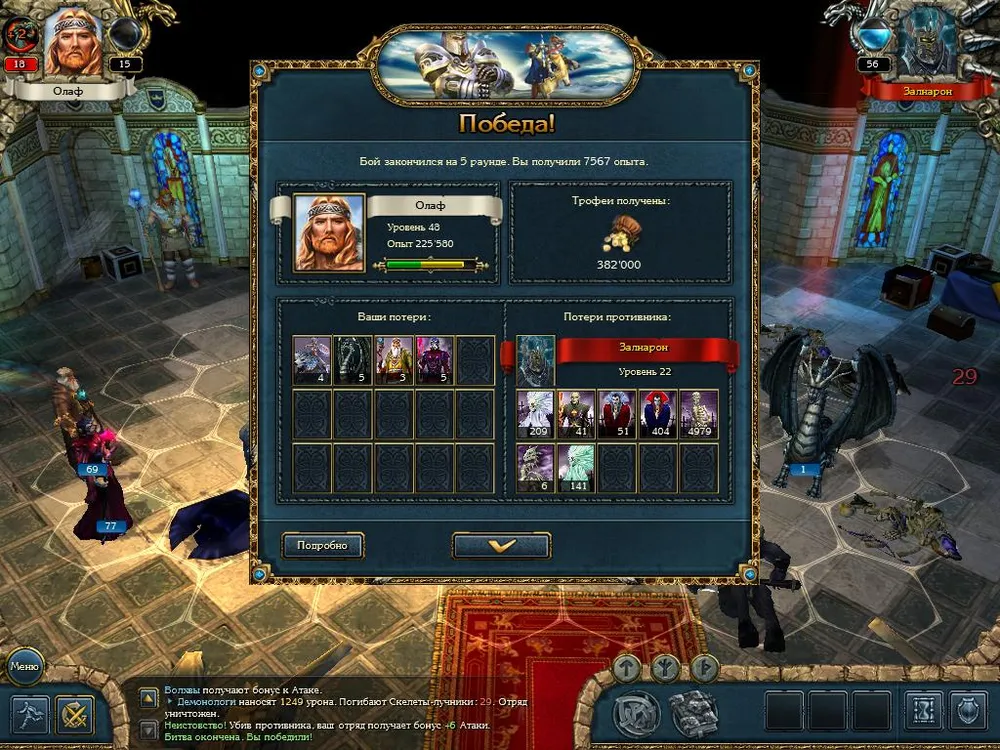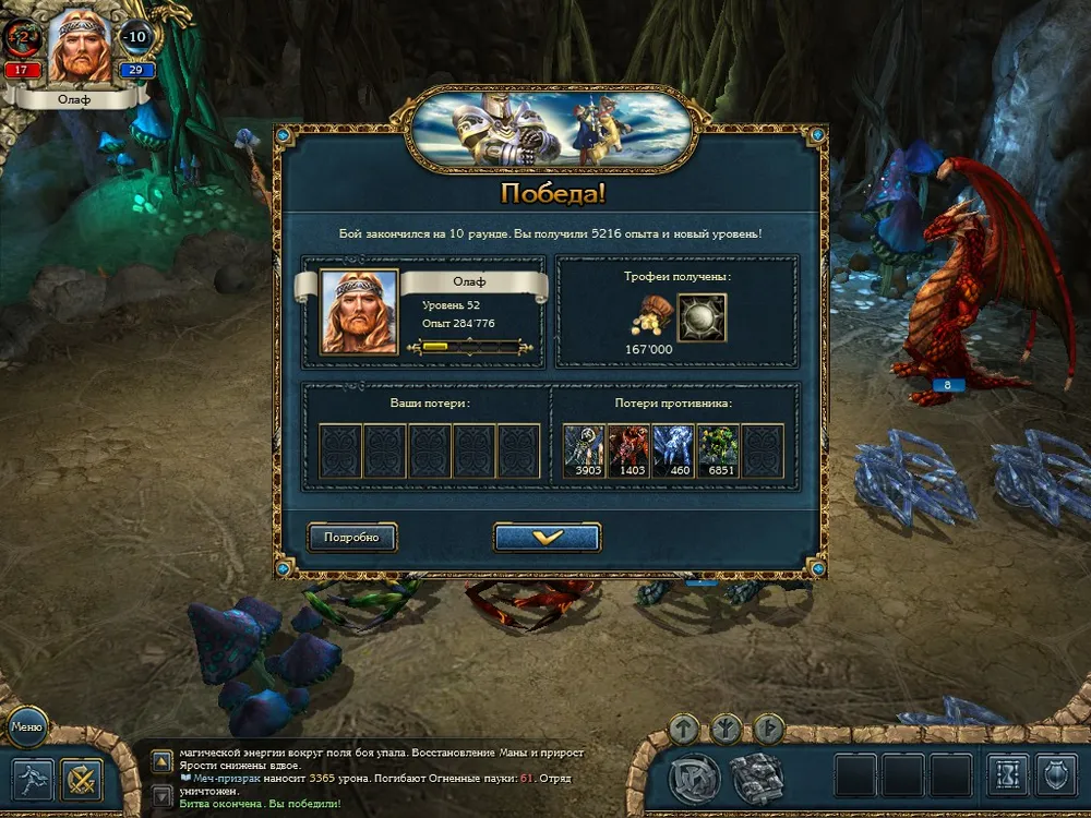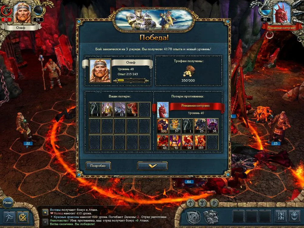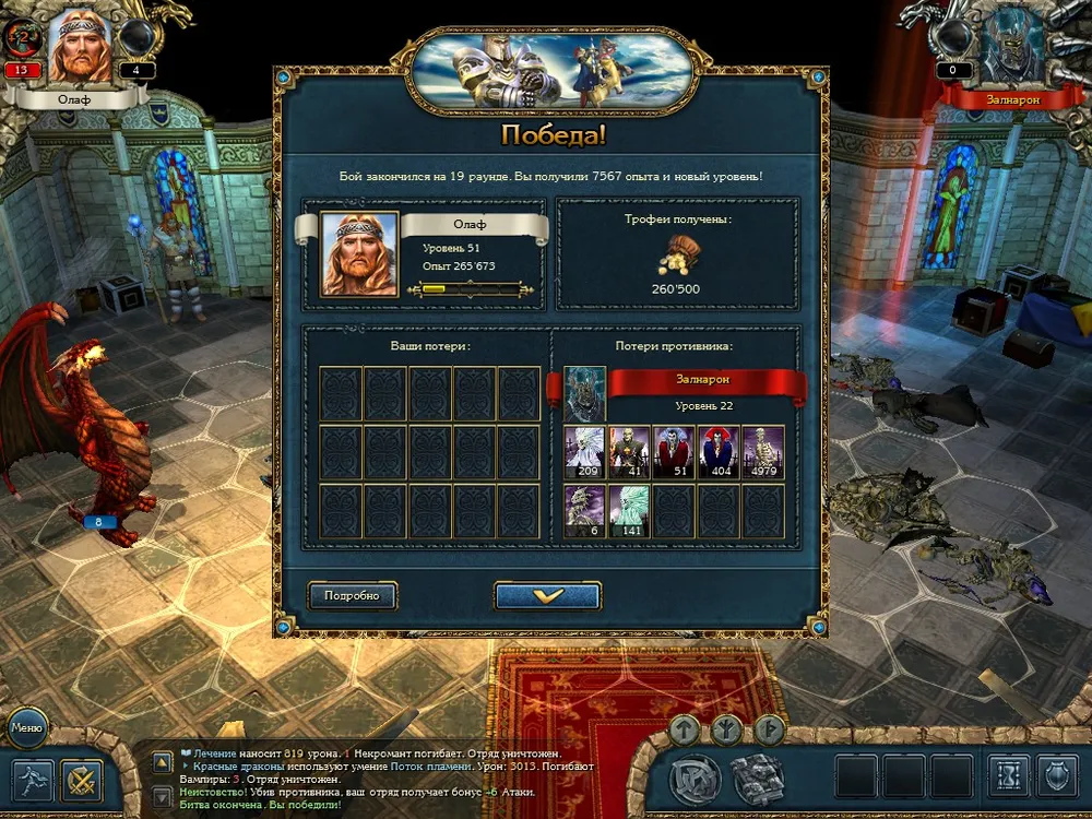 Единственный отряд красных драконов ушёл в невидимость, а на скелетов-лучников посыпались огненные стрелы. Вражеский герой вынужден был тратить ману на снятие эффекта горения со своих бойцов — вот оно, преимущество огненных стрел перед магическими! К тому моменту, когда и у меня и у него закончилась мана, лучники были уничтожены, а остальные отряды — ослаблены. Драконы легко завершили разгром.