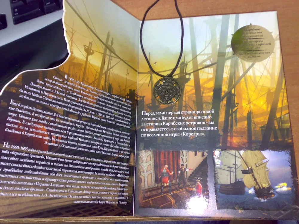 В dvd-боксе с игрой находим руководство и surprise! не амулет,а всего лишь медальончик с весёлым роджером,названием игры и 2008 римскими цифрами(насколько я понял амулет Ацтеков был только в первых тиражах игры).Фото "амулета ацтеков",найденное на просторах инета:
