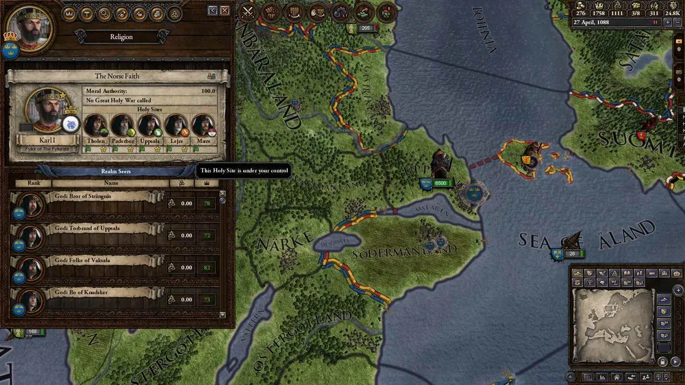 Реформирование веры нелегко. Вам потребуется контролировать три святыни и большой показатель благочестия в придачу. После реформирования вы получите главу религии. В случае со скандинавами, персонаж, который проводит реформацию, станет Филкиром [Fylkir; Если верить гуглу, то персонаж станет исландским футбольным клубом, но если попробовать перевести с современного норвежского, то выходит что «fyl» - графство, а «kir» - церковь, хотя, делать из этого выводы – диагноз и Задорнов стайл - прим.], выступающим в роли и светского правителя, и религиозного лидера, во многом похожим на исламского Халифа. Вы сможете объявлять священные войны: хоть великие языческие крестовые походы, хоть обычные религиозные войны против неверных. Главе также подчинены другие языческие религии, по аналогии с Вселенским Патриархом Константинопольским.