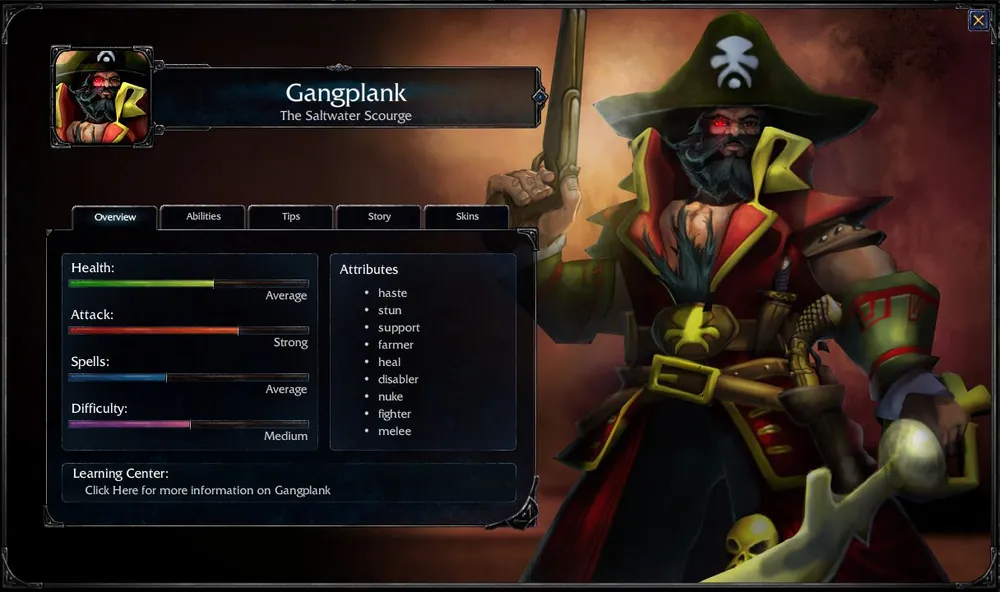 Gangplank родился в семье известного пирата Винсента "Тени". Винсент хотел, чтобы его сын вырос жестким и сильным, потому был чрезвычайно строг с ним. Его желание сбылось, мальчик превратился в безжалостного пирата. Отец очень гордился Gangplank'ом в день его совершеннолетия – когда тот зарезал его ножом в спину и стал капитаном их пиратского корабля. Будучи уже взрослым пиратом, Gangplank стал одним из чемпионов великой Лиги Легенд.