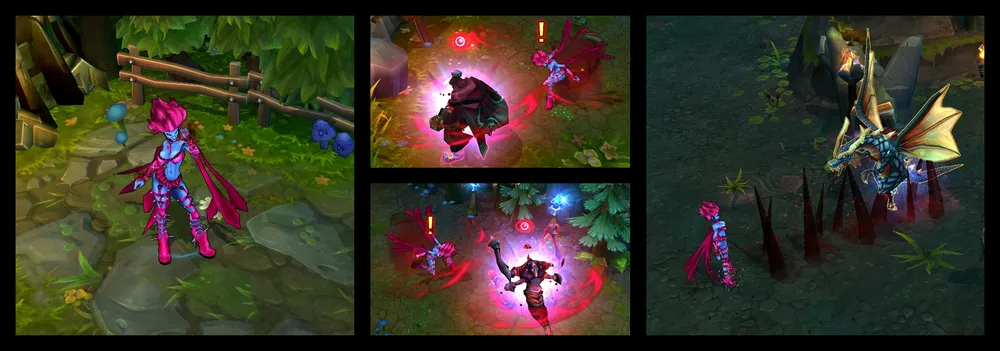 Эвелинна пронзает всех противников в выбранной области, нанося магический урон, основанный на их максимальном здоровье и замедляя их. А также она получает щит, сила которого зависит от того, во сколько вражеских чемпионов она попала.