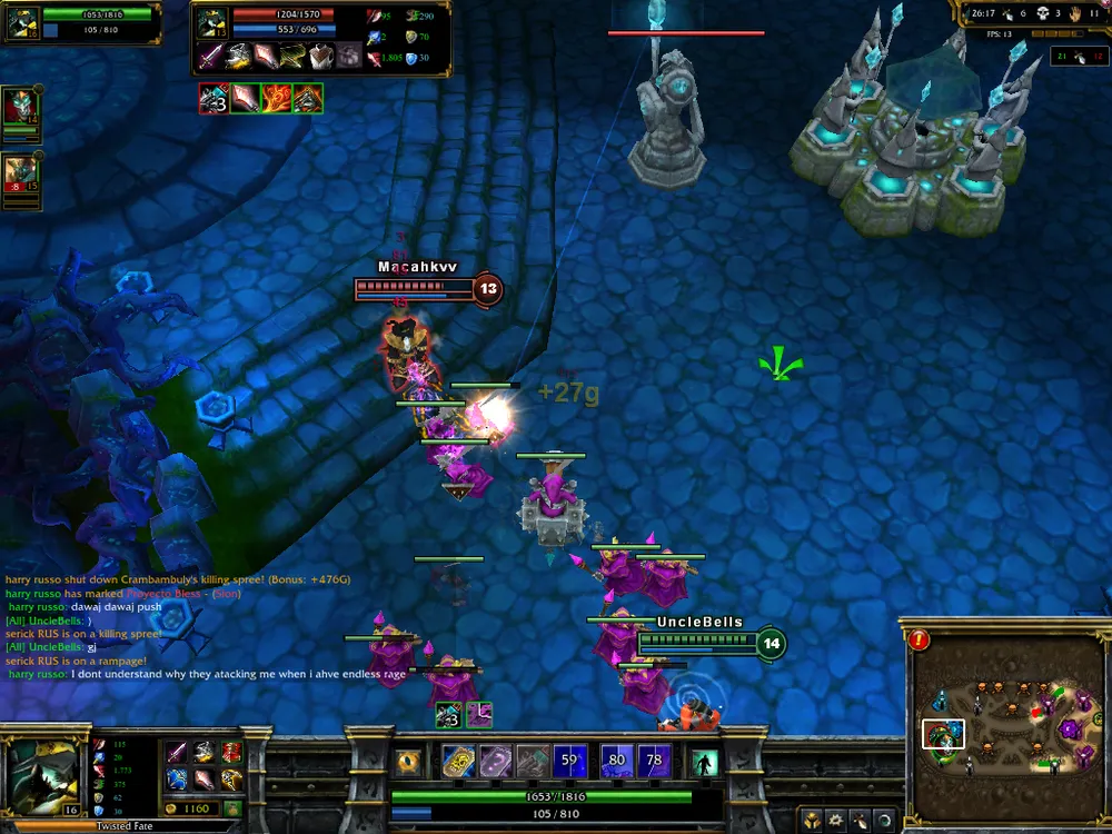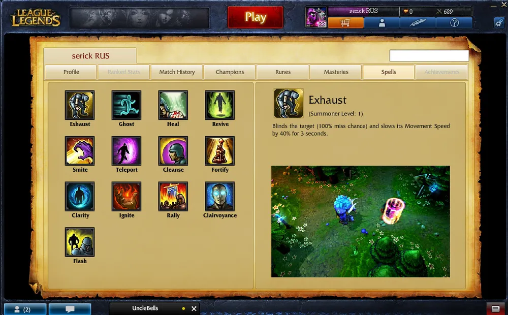 Возвращусь к теме тимплея. Чемпионов League of Legends можно разделить на два типа: это дамагеры и саппортеры (а вообще они условно подразделяются на пять классов: танков, магов, бойцов, ассасинов и помощников, причем один герой может относиться сразу к нескольким классам). Первые заняты тем, что наносят большой урон: конкретно по цели или по площади. К таковым относятся Пантеон (Pantheon) со своей беспощадной ультой (прыгает на отмеченный участок карты, нанося окружающим врагам урон и замедляя их), Олаф (Olaf), Тристана (Tristana), Кеннен (Kennen) и куча других воинственно настроенных существ. К команде поддержки приписаны, например, Блицкранк (Blitzcrank), который умеет вылавливать врагов своей «роборукой», Сорака (Soraka) и Тарик (Tarick), лечащие и стано-замедляющие герои, и десяток иных типов. Перед матчем вы должны просмотреть своих союзников, точнее, их «чемпионский выбор» и сделать свой, ссылаясь на то, чтобы команда была сбалансированной. Хороший вариант, к примеру, один танк-хиллер (или классический танк + хиллер для поддержки), один-два саппортера и герои, которые будут отвечать за повышенный урон по «позициям» неприятеля. Их задача: пусть и умереть, но нанести врагу как можно больше урона. Союзники, если что, добьют. Разумеется, такой классической тактикой в игре 5 на 5 отцы LoL’a не ограничиваются: знания приходят с опытом, потому вам придется поучаствовать в сотне сражений, перед тем, как выявить действительно успешную схему вашей командной игры. Также стоит запомнить, что одни чемпионы в игре сильны на ранних этапах игры, другие – на поздних. Потому тщательно планируйте каждый свой выпад: возможно, стоит дать врагу свободу и отсидеться у союзной башенки в начале партии, зато под ее конец выдать феерические «трипл-киллы». С другой стороны, кто не рискует, тот не пьет шампанское. Потому пробуйте различные варианты тактики и игры вашим подопечным – только так вы научитесь приносить пользу своей команде. А уж если неприятель сумел лихим образом вас зажать, и шансы выжить все быстрее приближаются к нулю, на помощь придут специализированные заклинания: спеллы (spells), которые спасли на аренах «Лиги легенд» не одну и не две жизни.