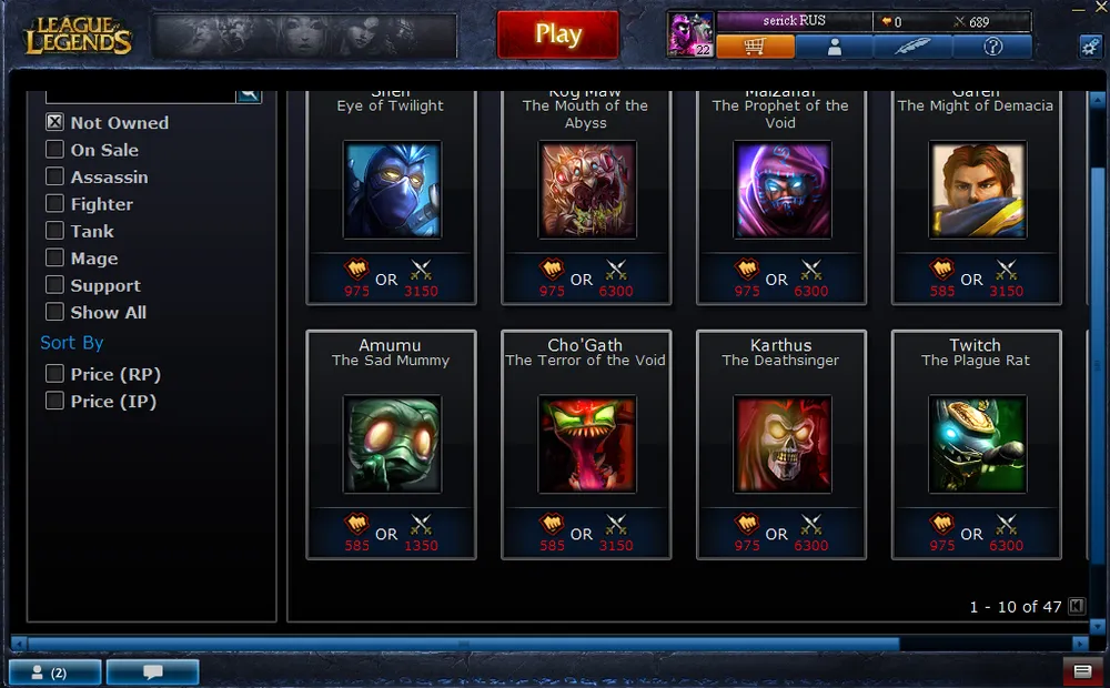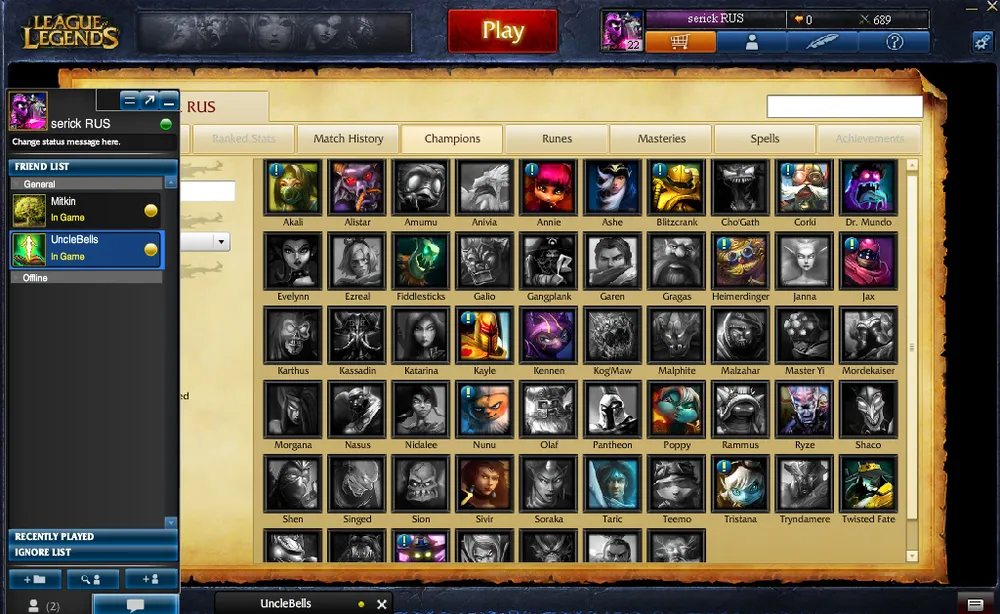 Список всех чемпионов в игре. Те, что подсвечены и без восклицательного знака, - куплены