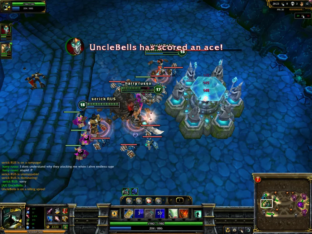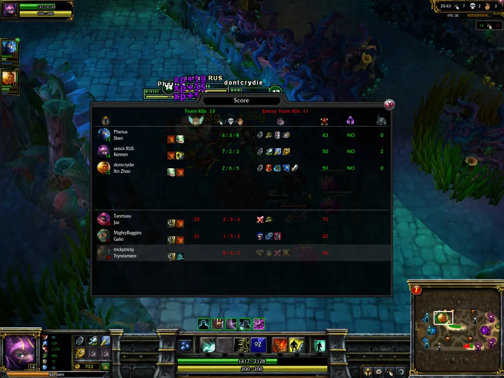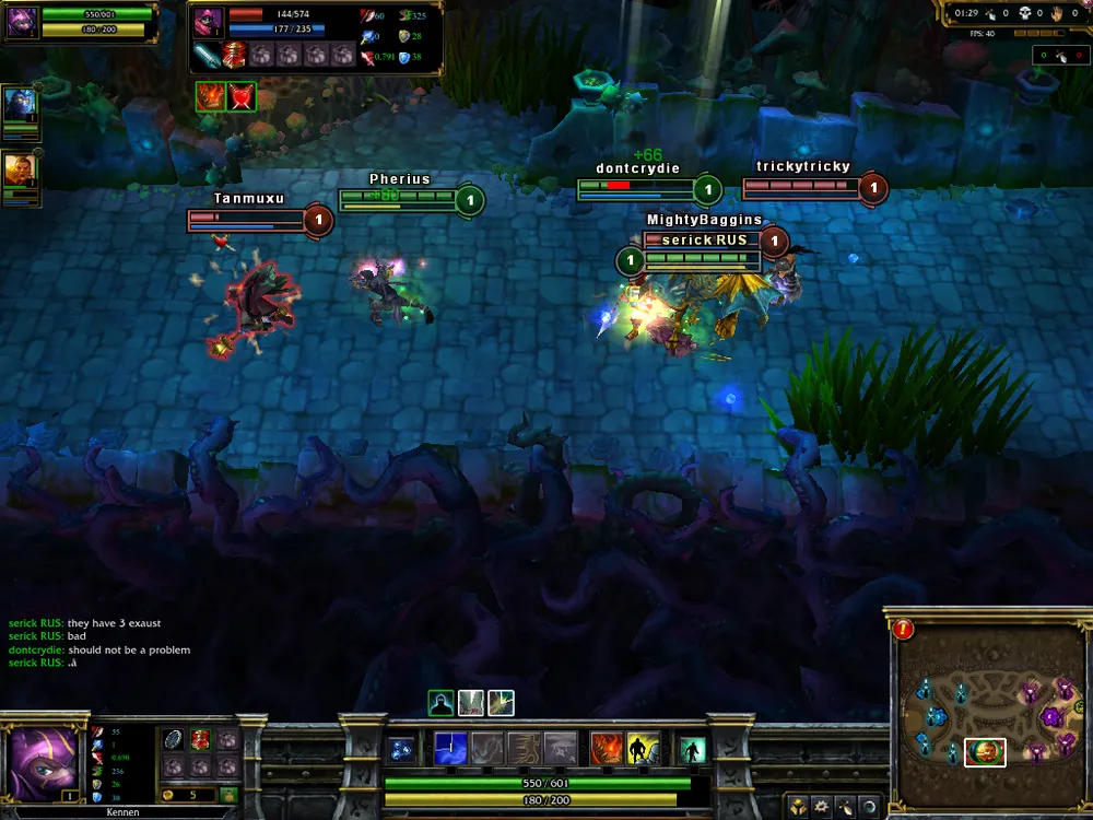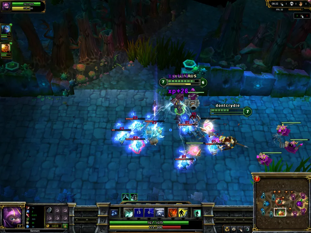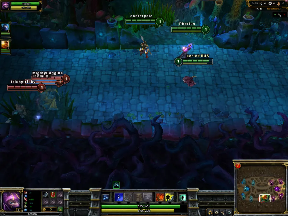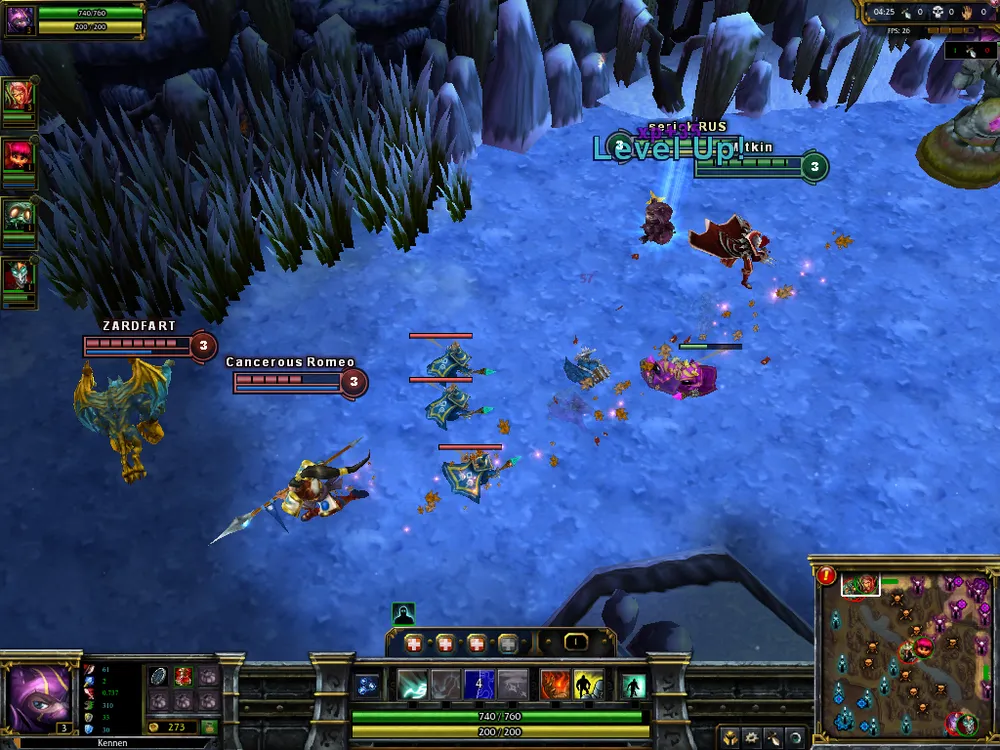 Много было сказано о командной игре в режиме 5 на 5, потому хочется и пару слов посвятить бою на шестерых бойцов. Главное отличие карт в том, что в игре 3 на 3 можно свободно сражаться и без друзей (это, конечно, в теории и немного на практике – и тут есть шанс налететь на сплоченных игроков). Также позволено брать любого чемпиона (в том смысле, что можно меньше озираться на выбор союзников), ибо в основном исход матча зависит от пары троек взаимных столкновений сторон. Следовательно, от вас требуется максимум отдачи. Команда, потерявшая в «замесе» одного-двух бойцов (если трех, то это, как говорится, fail), явно лишена нормального построения, какая-то линия останется без защитников (а всего линий на картах 3 на 3 - две), и, скорее всего, она потеряет как минимум одну вышку, если не больше. Потому перед тем, как атаковать врага, нужно сто раз подумать (ну ладно, один раз, зато тщательно): возможно, эта битва и будет последней в этой партии. Не стесняйтесь пользоваться кустами – в них чемпионы имеют свойство исчезать, становиться невидимыми. Такую возможность грех не использовать, поэтому 80% команд стараются на самых ранних этапах (и на поздних, конечно же, тоже) «ганкать» соперника: либо убивать того, кто стоит на «соло» (один игрок на линии), либо уж, воспользовавшись эффектом неожиданности, попробовать снести всю команду суперника (бывает и такое). Так что следует правило: прежде чем лезть в густую растительность, необходимо проверить их на наличие партизанов. Можно воспользоваться спеллом «Ясновидение» (Clairvoyance), а можно более простым вариантом – умениями ваших героев. Кеннен, например, способен запускать по-прямой сюрикен (ниндзя все-таки). Запульнув его в кусты, вы узнаете, чисты они или нет. Это определяется по характерному звуку попадания по цели. Попали? Все, кустарник занят, лезть туда не стоит. Если, конечно, у вас нет скилла массового поражения (таковым обладает, к примеру, Ганкпланк (Gangplank) ) – такой способностью стоит сначала потрепать противника, а затем попробовать добить. Убив оппонентов, команда должна тут же воспользоваться полученным временем (как и в «Доте», в LoL воскрешение чемпиона занимает приличный отрезок времени) и снести одну и более вражеских башен. Получив преимущество, двигаемся дальше и играем в том же ключе, пока не снесем Ингибитор (Inhibitor) противника (после этого с нашей базы будут идти гипер-мобы), а затем и сам Нексус. Как может показаться на первый взгляд, техника победы проста. Но это только на первый взгляд. Многочисленные ошибки, которые допускают союзники на протяжении матча, могут «раскормить» соперника (одно из правил: не стоит в одиночку бегать по джунглям – вас запросто могут выловить и убить втроем; также в «лесах» могут бегать такие жуткие типы, как Warwick, - их то уж точно не стоит откармливать), дав им денежное и уровневое преимущество, тогда и сиди-думай, как выкарабкиваться из ситуации. При этом замечу: пусть счет 6-14 и удручает (отношение фрагов команд), но это еще не показатель победы. Как я уже писал, зачастую итог игры решается в одном бое на хай-левлах (потолок чемпиона в League of Legends – 18 уровень): так как время респауна составляет крайне длительное время, то смерть всей команды можно засчитывать как поражение. На поздних этапах игры снести башню труда не составит, а Нексус – тем более, а так как делается все это буквал