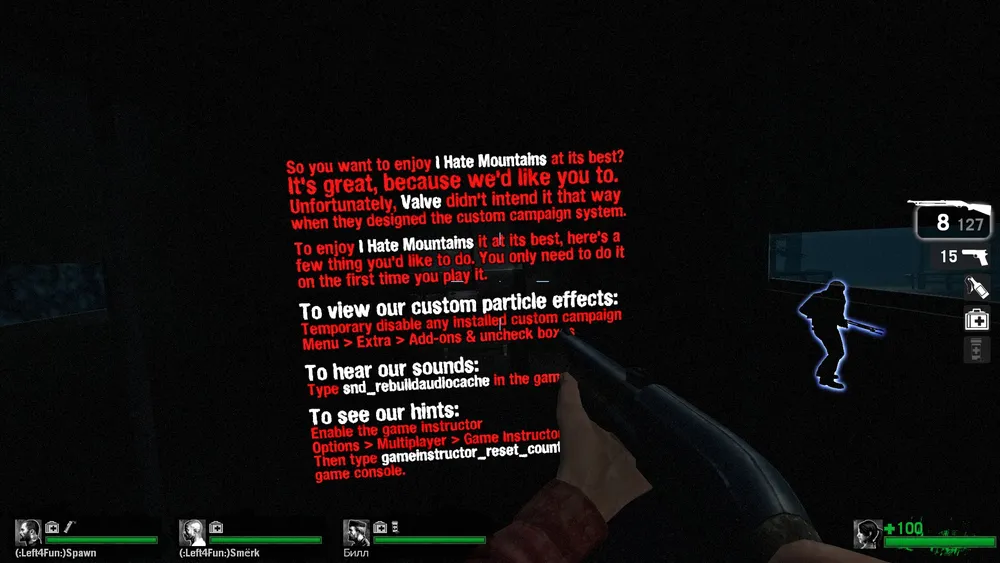 Чтож, после того, как я доиграла кампанию в первый раз, меня переполняли разные чувства: на смену радости от избежания мозгоразрыва постепенно пришло чувство, что тем, кто это придумал, нужно забить гвоздь в голову! Ибо в первый раз мы играли её ооочень долго, бегали по всем этим лабиринтам, кляня разрабов, не один час. Однако нужно признать, что что-то все-таки заставляет возвращаться в IHM еще и еще, толи эта самая нелинейность карт, толи эти красивейшие пейзажи, толи просто уже приелись оригинальные кампании Valve, а обещанный "летний DLC" благополучно забыт. Впрочем, еще один большой минус I Hate Mountains конкретно для меня - это то, что я, мало того, что с компанией друзей просто насилую мозг, разгуливая по горам и лесам IHM, так еще и напрочь лишаюсь возможности играть в неё одна, с ботами, будучи человеком, страдающий топографическим кретинизмом, и порой умудряющимся заплутать даже на оригинальных картах, по которым бегаю уже почти два года. В общем, это было моё имхо, с которым вы, естественно, можете не согласиться.)
