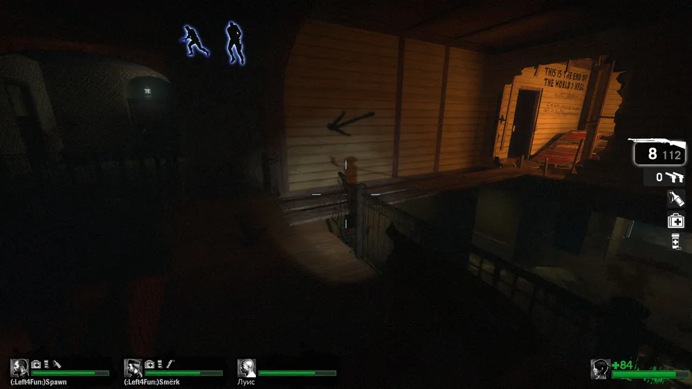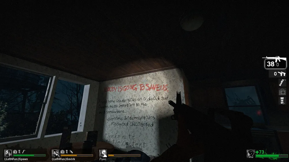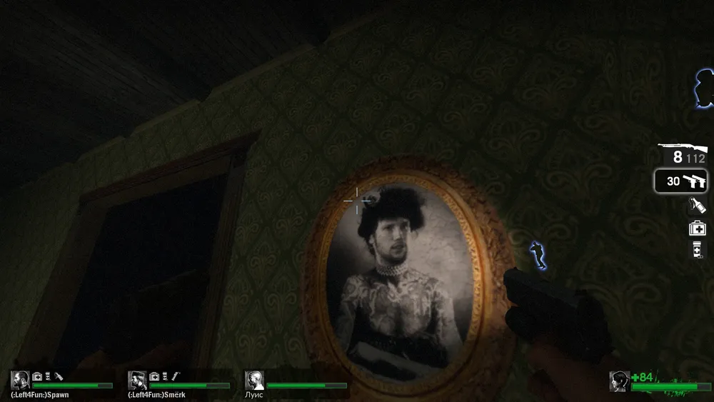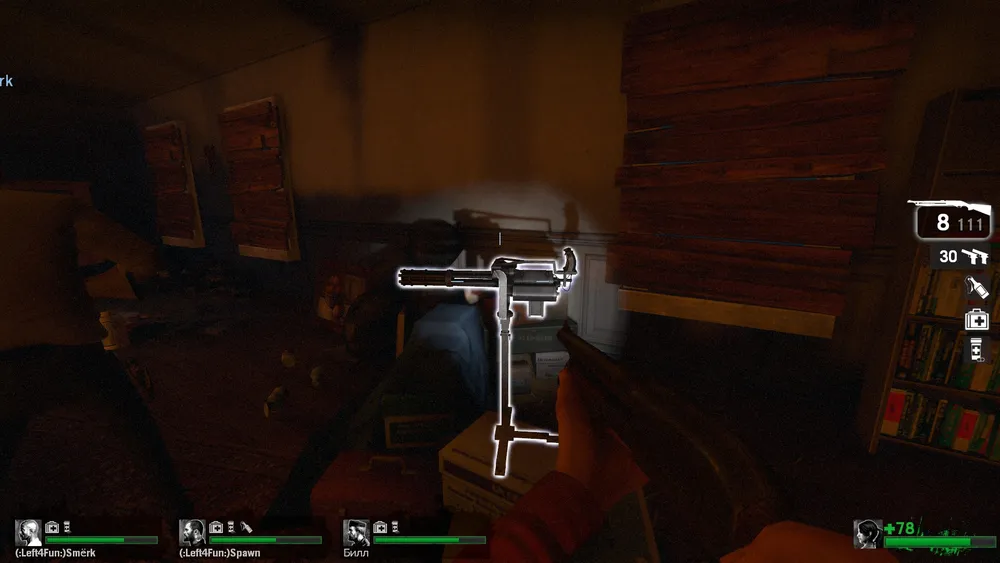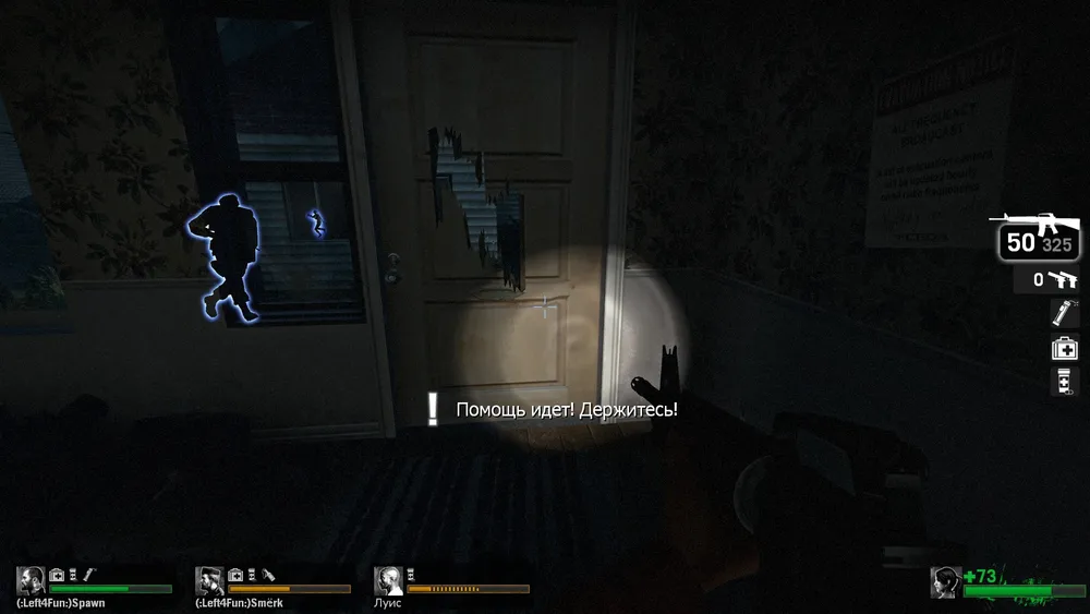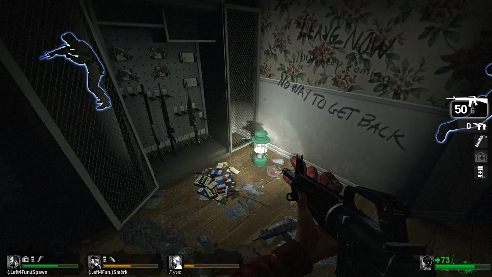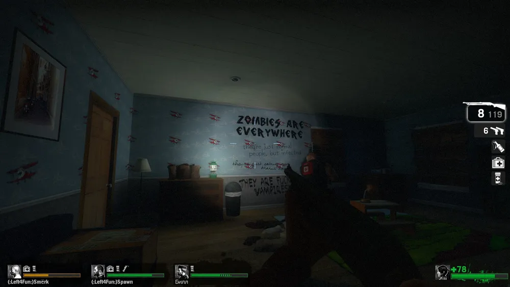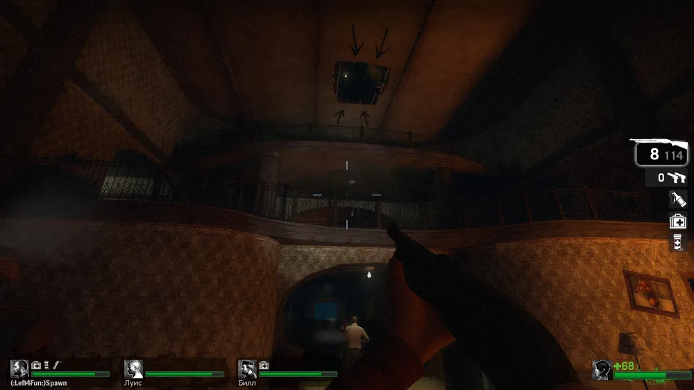 Однако на этой карте главная наша задача не побродить по некогда роскошному поместью и пострелять зомбей, а вызвать спасателей. Для этого один из членов команды должен залезть на чердак и включить радио. К чердаку ведут вот такие стрелки по всему дому: