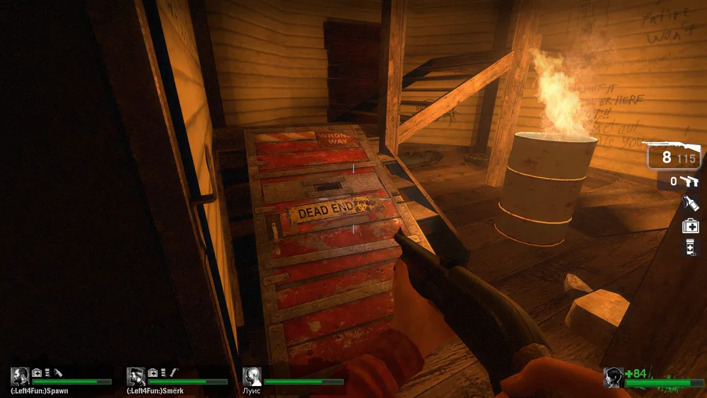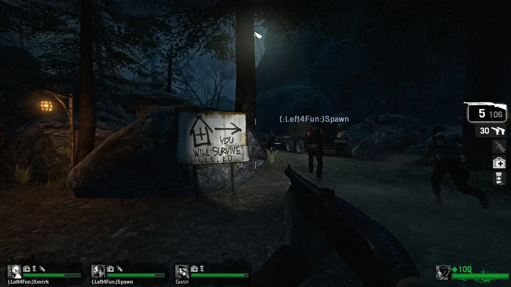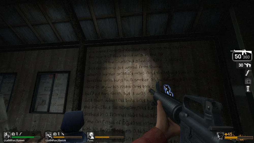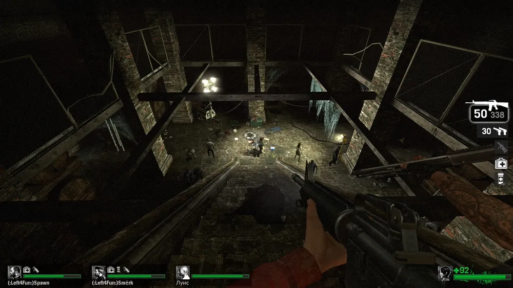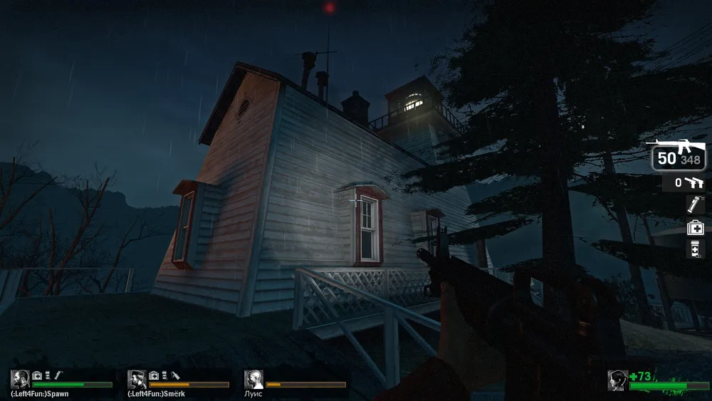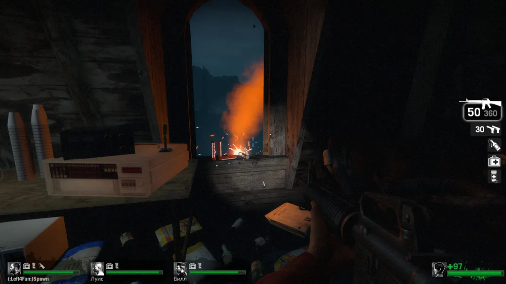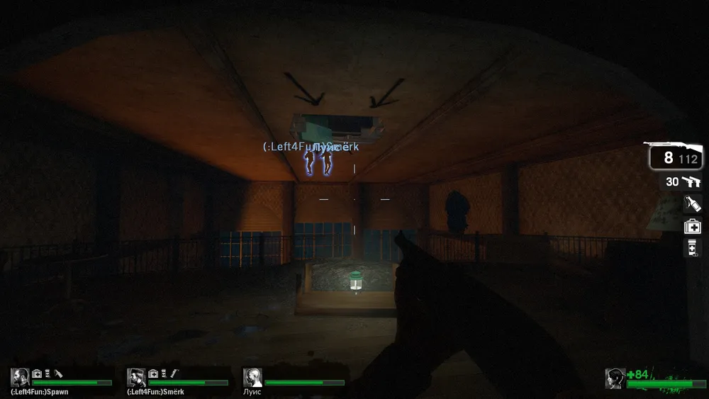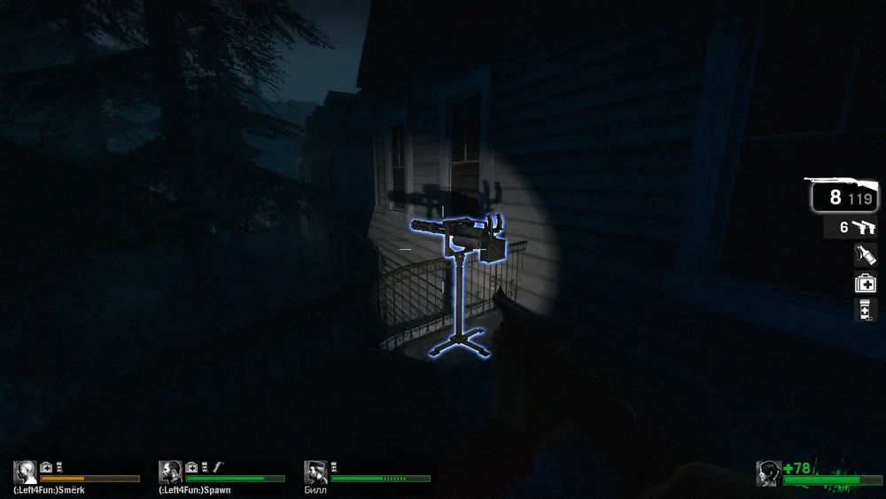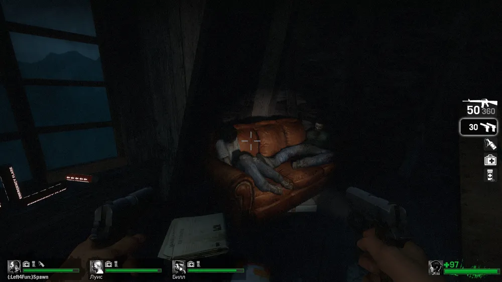 Однако на этой карте главная наша задача не побродить по некогда роскошному поместью и пострелять зомбей, а вызвать спасателей. Для этого один из членов команды должен залезть на чердак и включить радио. К чердаку ведут вот такие стрелки по всему дому: