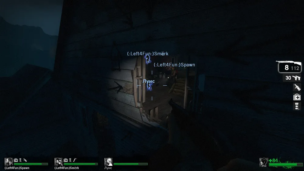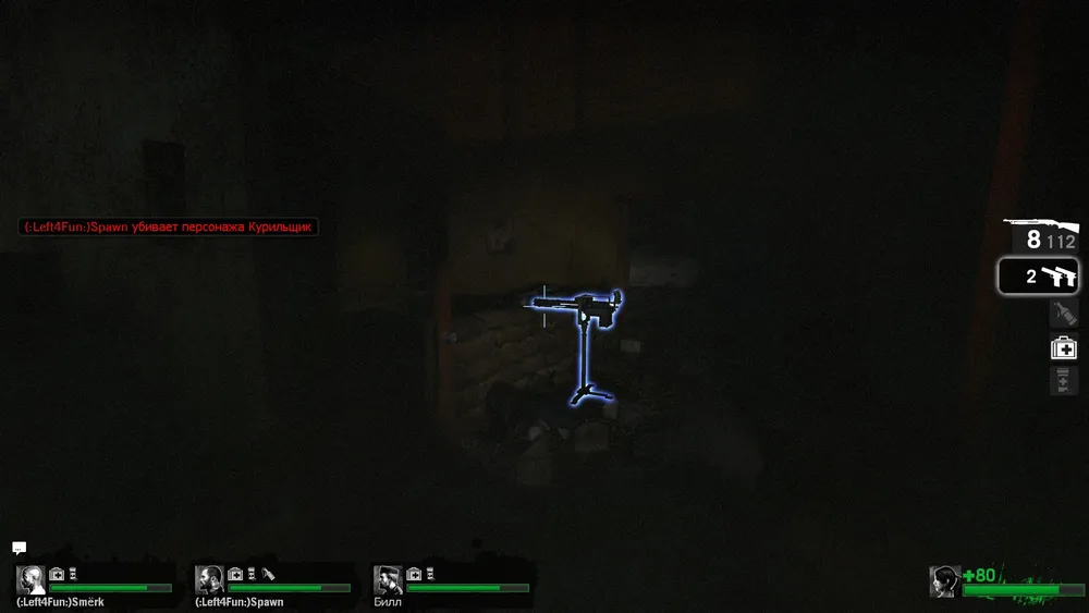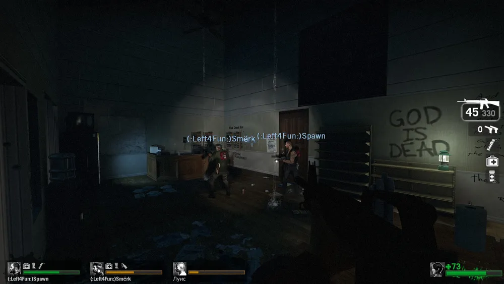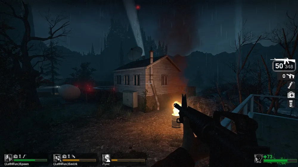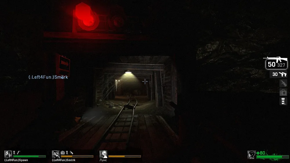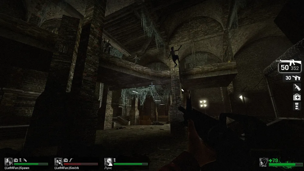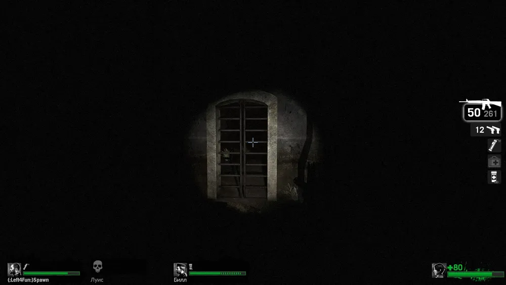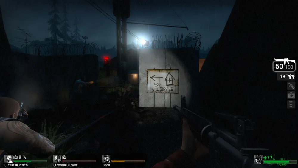 Однако на этой карте главная наша задача не побродить по некогда роскошному поместью и пострелять зомбей, а вызвать спасателей. Для этого один из членов команды должен залезть на чердак и включить радио. К чердаку ведут вот такие стрелки по всему дому: