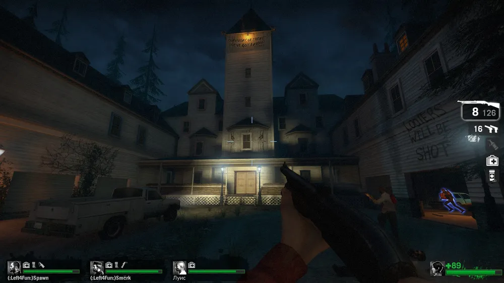 Чтож, поместье. Как только вы покидаете убежище, вы сразу же выходите к поместью. Вот, собственно, и оно, с надписью "Здесь выжившие", как это обычно бывает в любом фильме про зомби.