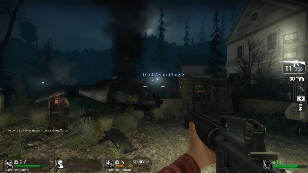 Сразу же после этого вы должны бежать на улицу, о чем, впрочем, если вы вдруг замешкаетесь, вам сообщат и сами герои. Сразу же к вашему выходу из дома *о_о* на вертолетной площадке вас будет ожидать, видимо, волшебник в голубом вертолете.*Таки волшебник, не иначе, ато как бы он меньше чем за минуту прилетел??* Однако, играя в первый раз, даже уже подбегая к вертолету, чувствуешь одним местом, что какой-то тут подвох, ибо только вторая карта, и выжившие ну никак не могут сейчас так легко и просто улететь восвояси. Так оно и есть. Как только кто-то из четверки приближается к вертолету более чем на 10 метров, тот вдруг взлетает, и...падает. *Совсем нелогичный, да* После этого всей команде не мешкая нужно бежать к зданию, подход к которому открыл вертолет, сломав забор, преграждавший путь. Однако здесь будьте осторожнее! Возле вертолета куча багов, в которые легко угодить и застрять. Вот, кстати, несколько скриншотов, когда мы с товарищами все трое находимся в "подвешенном состоянии":