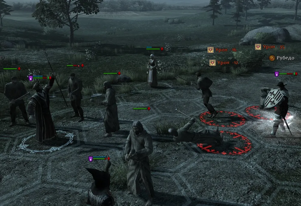 Увы, за остаток ночи просто не успеть добраться до лесной хижины, поэтому займёмся более близкими делами. Теми, что по силам тройке спутников. Например, разрушенную церковь Килиана, которую ещё предстоит посетить в будущем, с наступлением ночи облюбовывают сатанисты под командой – кошмар! - ересиарха. Если один из воинов будет сведён с ума, это печально кончится для всего отряда. Поэтому решающее значение в этом бою имеет построение воинов.