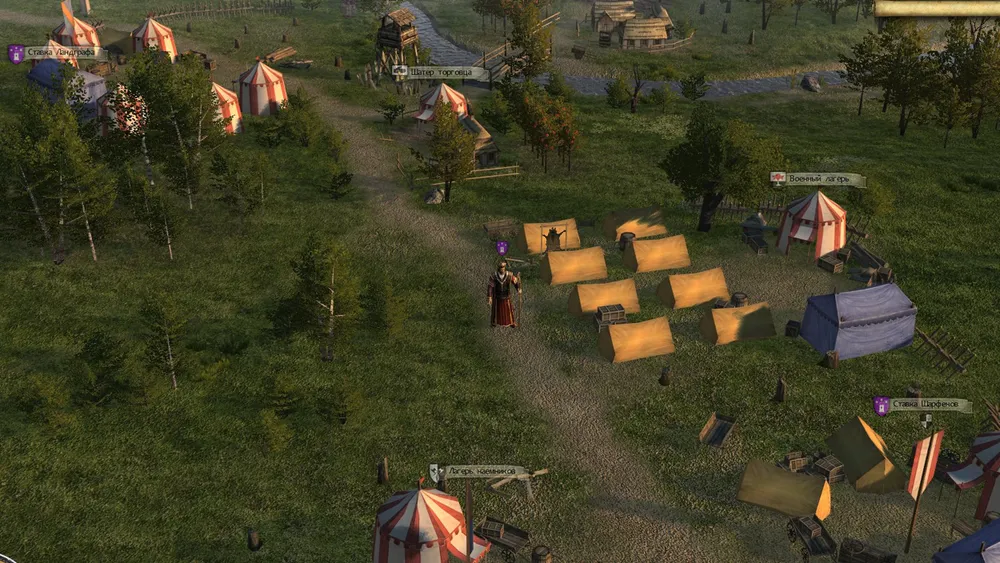 Проходя игру не в первый раз, я ухитрился сделать неожиданное открытие: состав наёмников в этом замке время от времени меняется! Не верхний слот с двумя дворянами, а нижний. Если прийти туда через двое-трое суток, то очень может быть, что удастся нанять тяжёлого пехотинца, разбойника или даже атамана. Для меня так и осталось загадкой, почему это можно сделать только здесь: на всех остальных картах бойцы «разбойничьей» ветки доступны исключительно в тавернах и за постоянную плату. А нанимаемые в деревнях крестьяне попросту не желали становиться разбойниками.