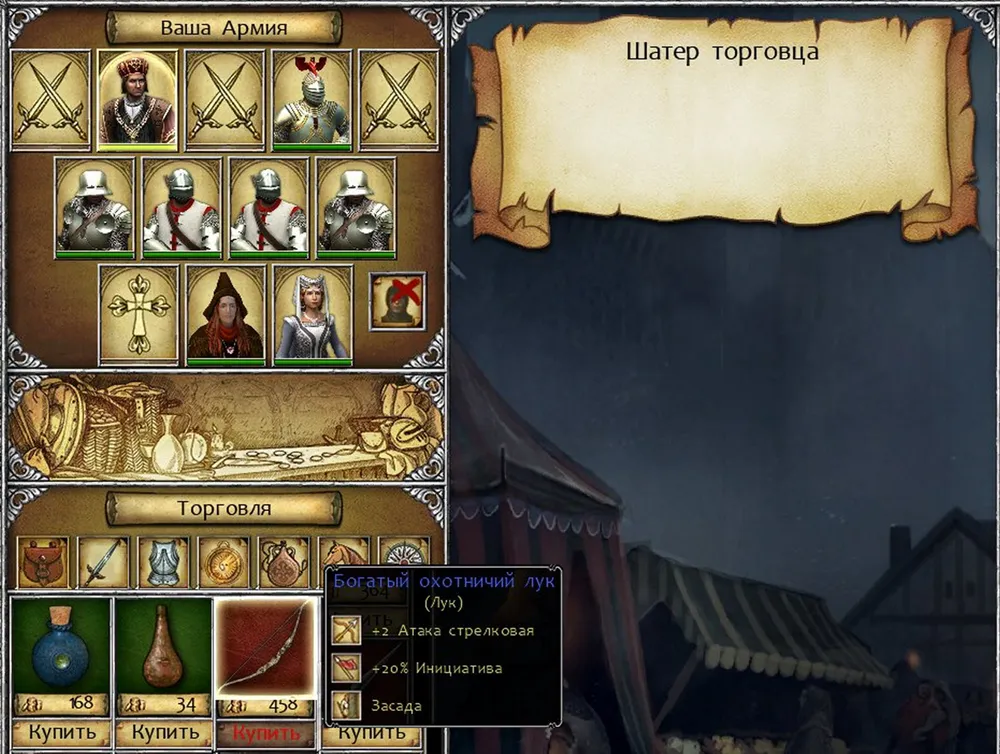 Едва наступает утро, торопимся нанимать бойцов: численность отрядов на этой карте ограничена (всего восемь спутников!), необходимо, чтобы они были сильными. Оставляем соратников в лагере, герой продолжает охотиться на нежить.