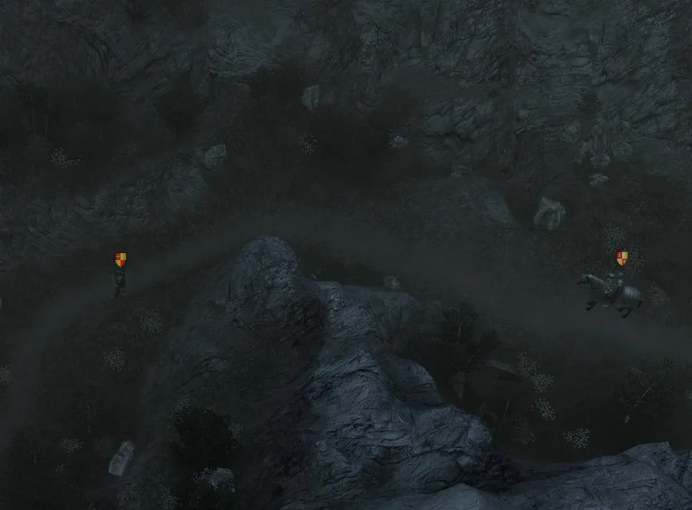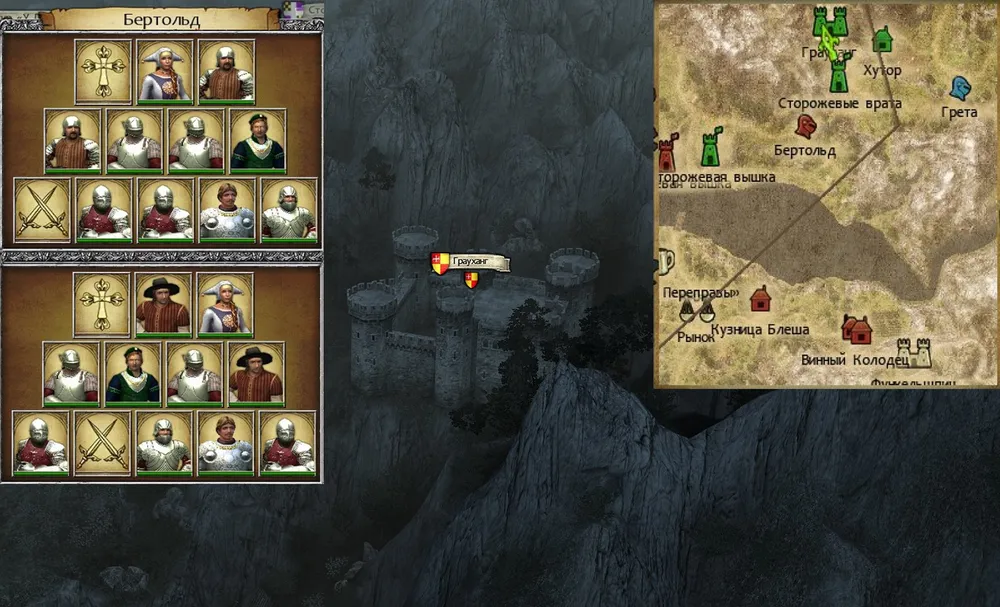 Ночью (чтобы ослабить вражеских стрелков) атакуем ворота. Вновь оставляем отряд для поправки здоровья, герой поднимается в горы за кладом. Если остались лечебные зелья – подлечиваем отряд и, пока не закончилась ночь, штурмуем замок. Увольняем наёмников, оставляем охранников и солдат в замке, а герой бегает туда-сюда по дороге, наблюдая за появлением Бертольда.