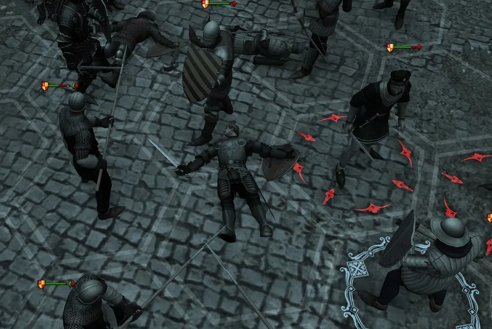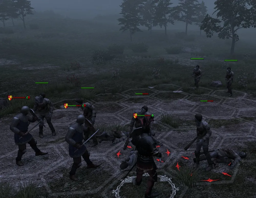 И тут я совершил сразу две ошибки… Первая: один из бойцов постоянного состава погиб, а я поспешил «уволить» труп. На следующей карте из отряда сбежали двое, и герой остался с одним спутником: никуда не годится. Я переиграл бой, трижды раненый арбалетчик не принимал в нём участия. А нужно было просто выставить мертвеца в первый ряд: полагаю, сработало бы! (кстати, попытка заменить мертвеца наёмником успеха не принесла!)