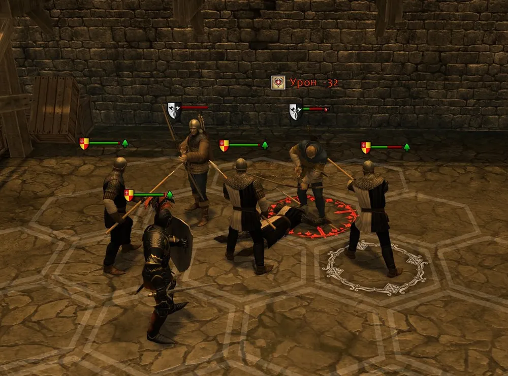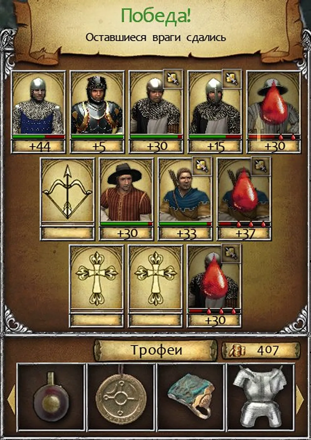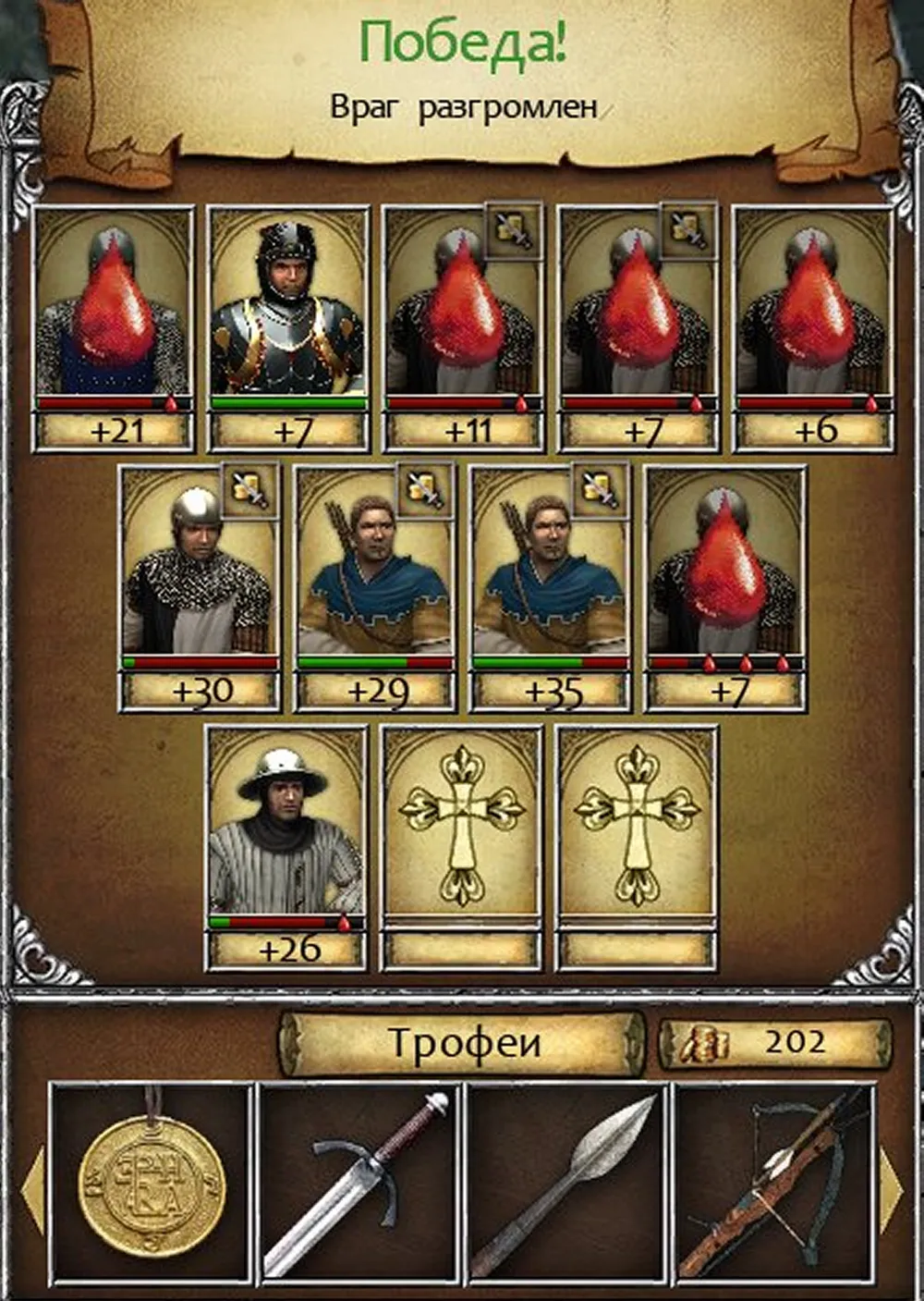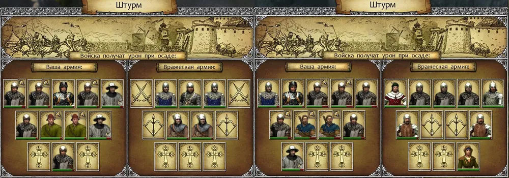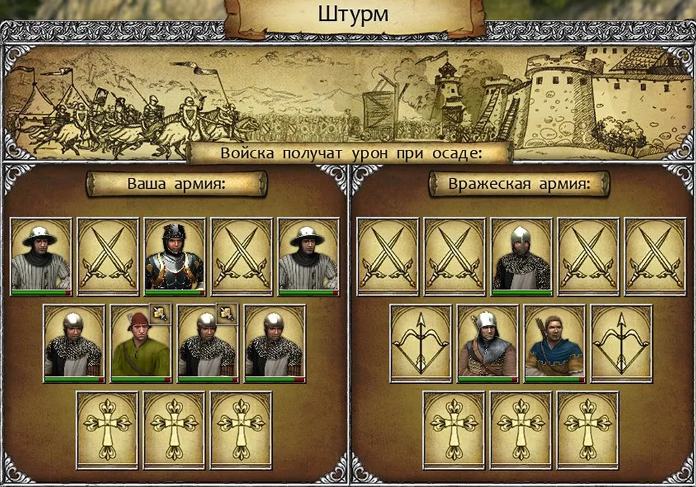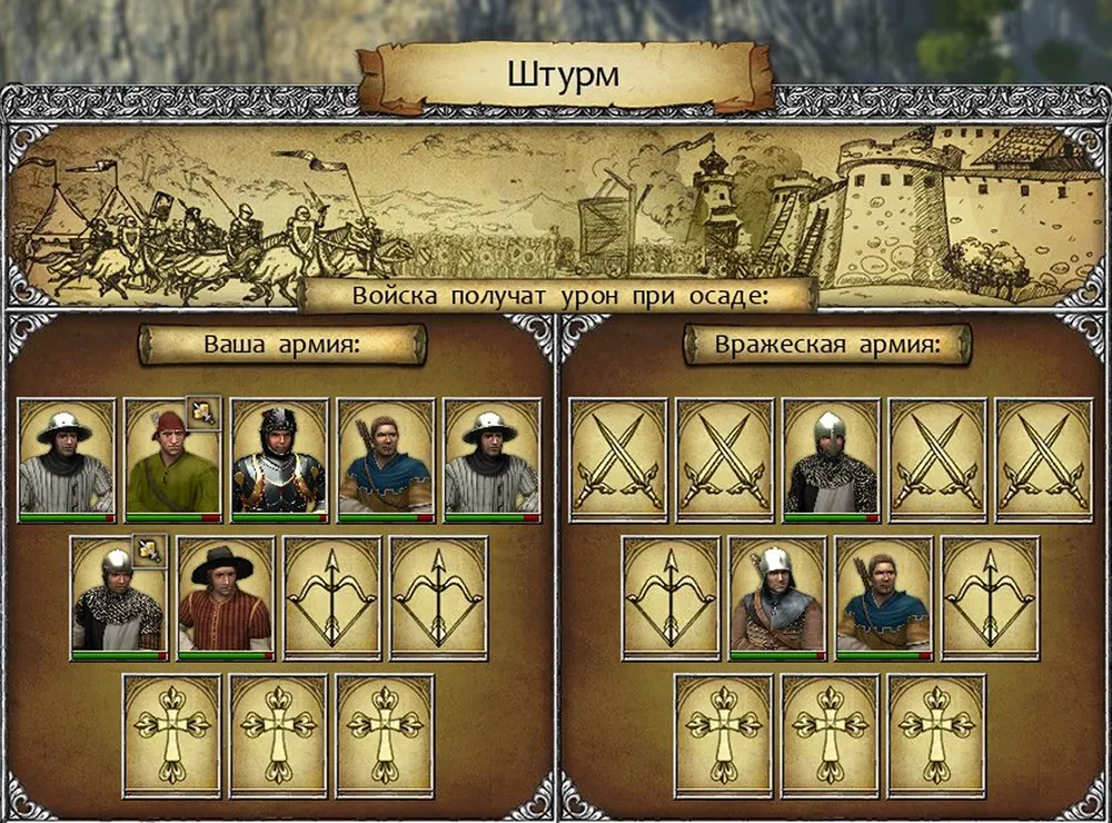 Герой стал вторым от левого фланга, сразу заблокировал сержанта пехоты, а его пехотинец получил возможность атаковать вражеского арбалетчика; едва ли не самого опасного из врагов. Бертольд был поднят на копья чуть ли не в третьем раунде, а чекан в руках солдата свёл на нет преимущество оруженосца. Ещё большую роль сыграли лучник и арбалетчики, лишившие врага медицинской помощи. Победа! (Уф… Игра не «выпала» и не «повисла», как при штурме замка Фихтенов…)