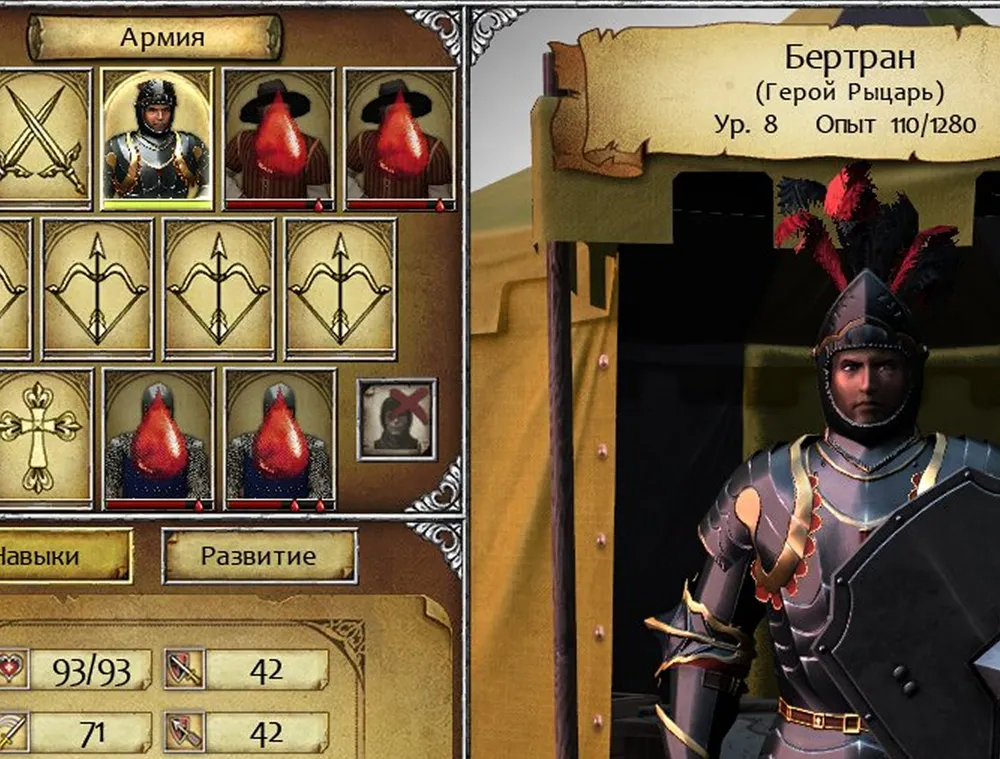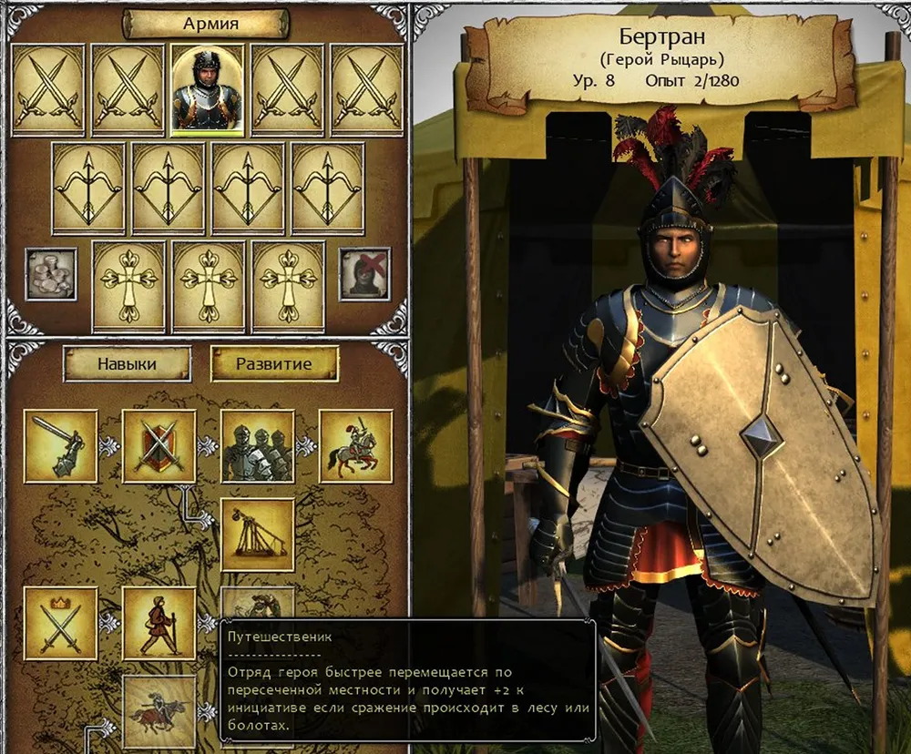 До получения восьмого уровня не хватало почти двухсот очков, пришлось покружить по карте. За двух убийц герой получал десять единиц опыта (они вырастали из дезертиров), за четвёрку мародёров – семь. Попутно приобрёл тяжёлый доспех с инициативой минус четыре, а не пять; и шлем, дающий прибавку к мудрости. Зачем было нужно добиваться восьмого уровня? Чтобы получить умение «Путешественник»; в этом случае герой несравненно быстрее передвигается по горам следующей карты. Плюс – увеличивается сила атаки и защита. Никакого кабасета брать не стал: ведущую роль в тяжёлых боях играет рыцарь, его ослаблять нельзя.