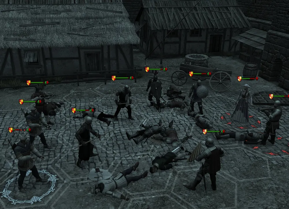 Оказавшись на следующей карте, разговариваем с рыцарем и получаем приглашение – посетить его замок. Можно нанять стрелка и двух солдат, я предпочёл только пехотинцев, как более устойчивых к вражеским атакам. В деревне к отряду присоединяется травница, и герой движется к шахте с проводником. Освободив последнего, не устраиваем засаду по его совету, а идём навстречу бандитам – ради большего опыта.