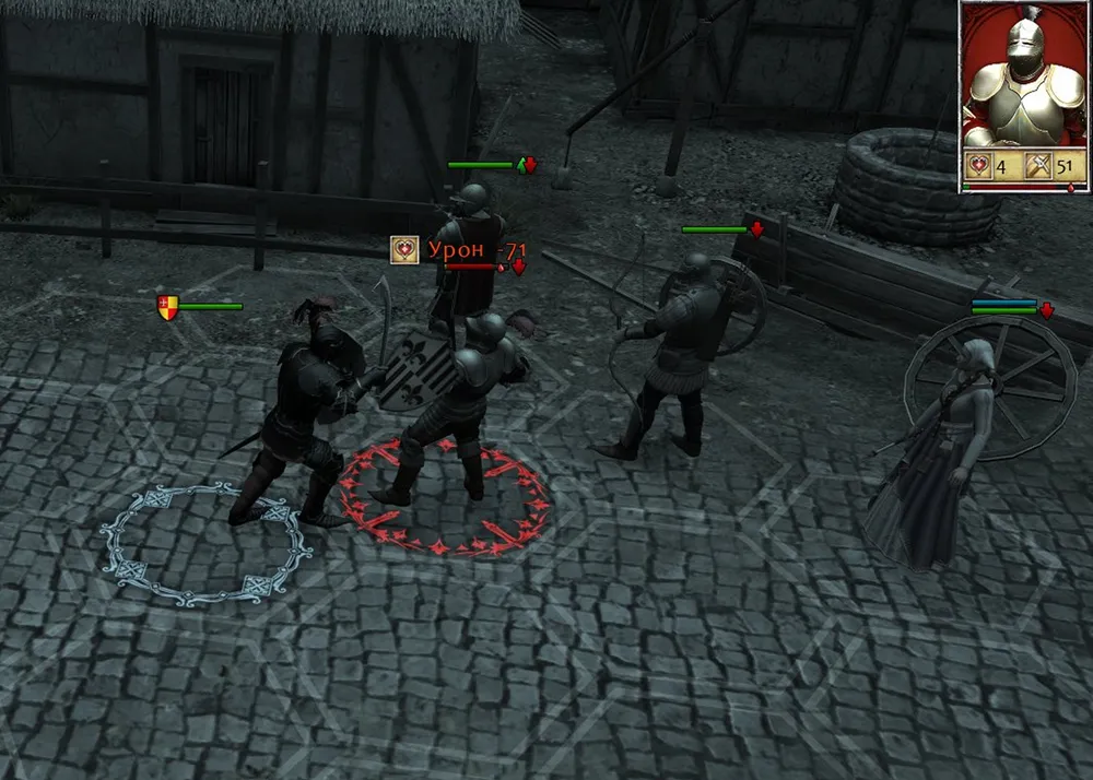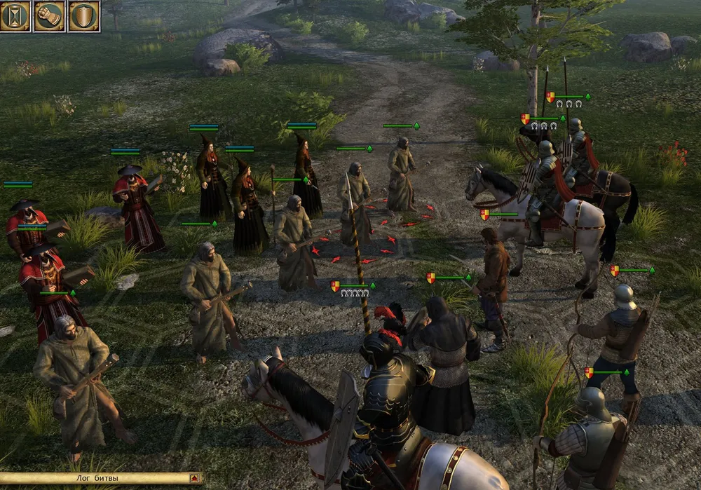 Отряд бандитов: два лучника, два убийцы, воин с алебардой и ведьма. Опыт! Уничтожен алебардист, уничтожен убийца; но ведьма запутывает ноги коню, а убийца – отравляет. Убийца уничтожен, но яд продолжает действовать, а ведьма сбрасывает рыцаря с коня; и он стоит под градом стрел, теряя здоровье. Зачем просто стоять, можно полечиться! Зелье, другое, путы спадают, ведьма превращается в две половинки. Но яд действует! Убит лучник, остался последний – и совсем чуть-чуть жизни героя. Завершающий удар! Победа? Как бы не так! Яд убивает героя! Поиграть битву после победы?! Ничего себе! Ладно, увеличим уровень здоровья…