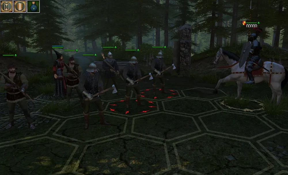 Река пересечена ещё раз, и проводник настойчиво тянет группу к своей хижине: отдохнём, полечимся, я голубя с запиской пошлю. Доболтался – навёл группу прямо на патрульный отряд. Короткая схватка, победа, но двое из отряда ранены. А ещё предстоит штурм замка! Но открывшееся среди деревьев зрелище мгновенно приободрило героя: часовня! Увы, она оказалась пуста… Но стоило положить на алтарь немного золота, как раненые тут же исцелились.
