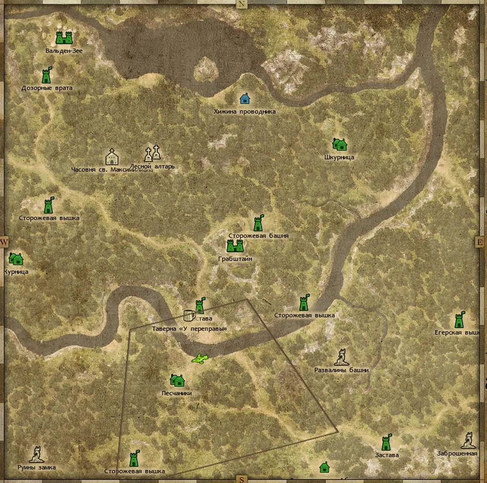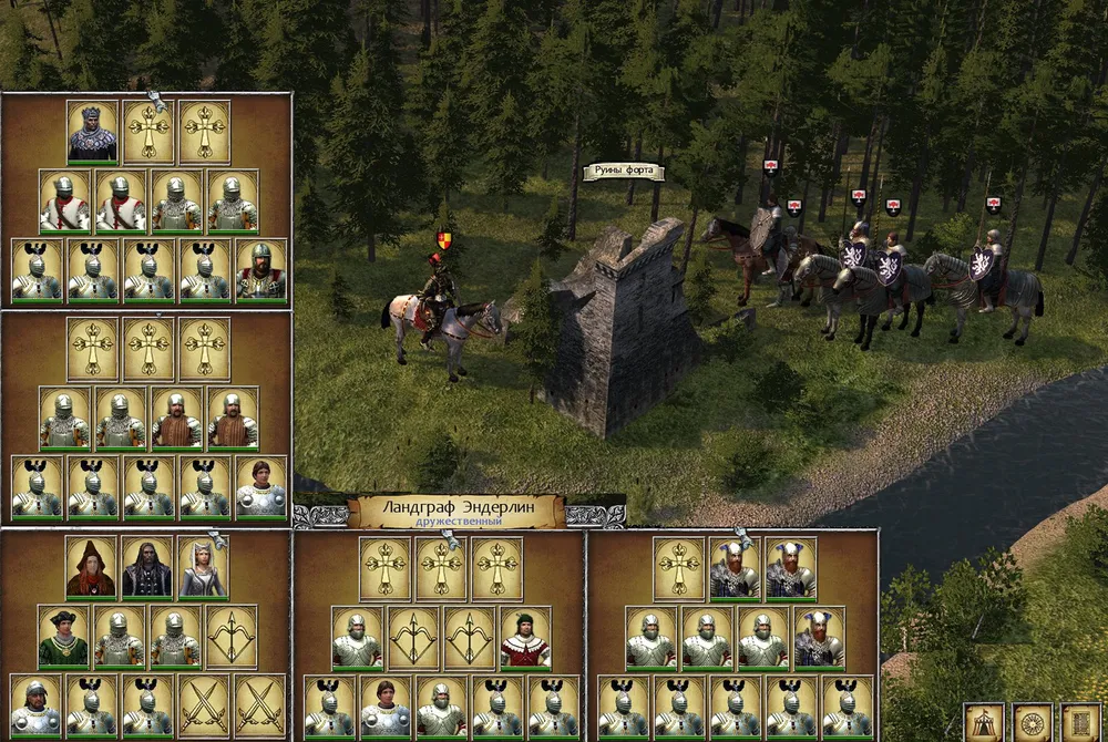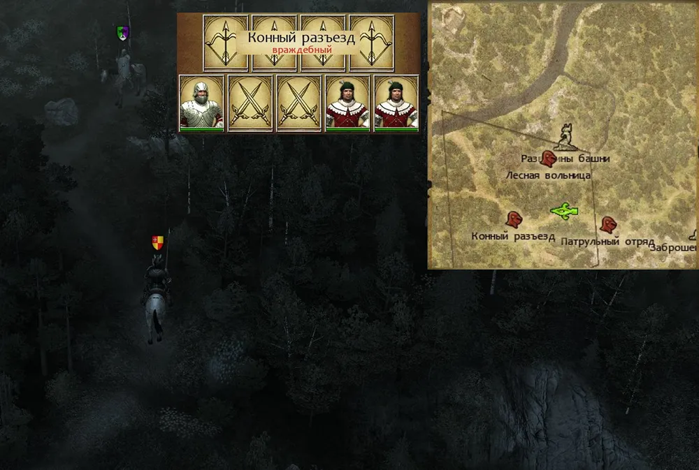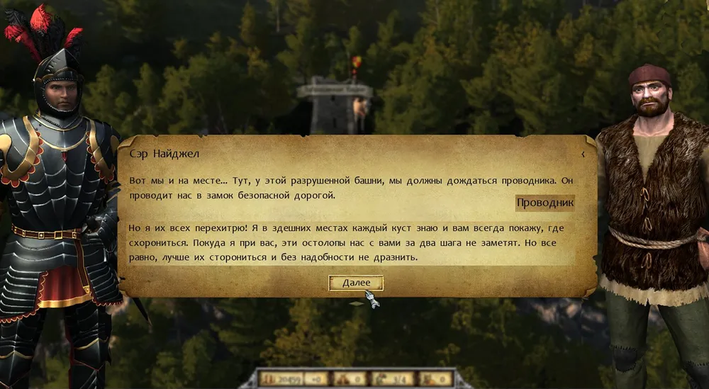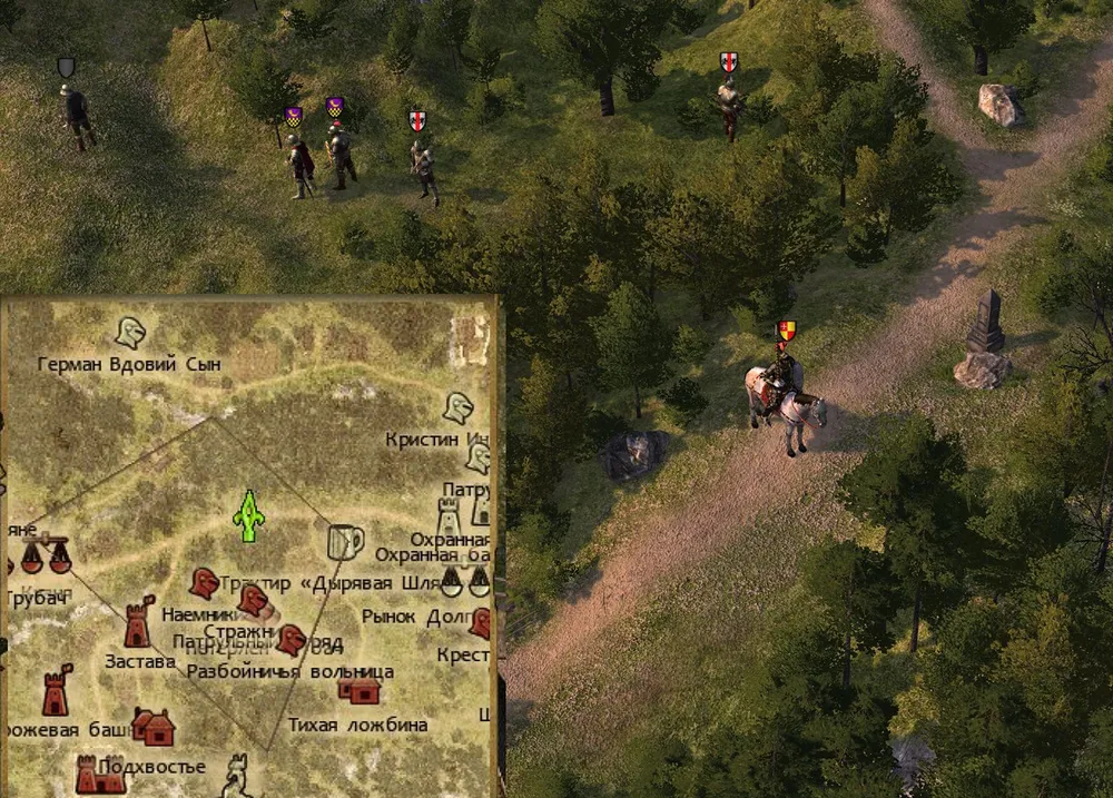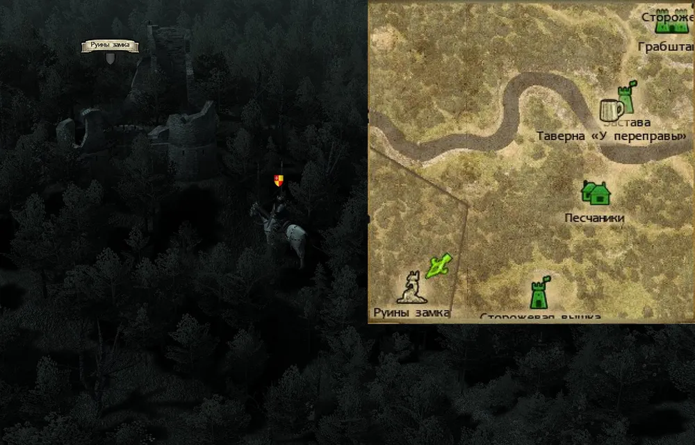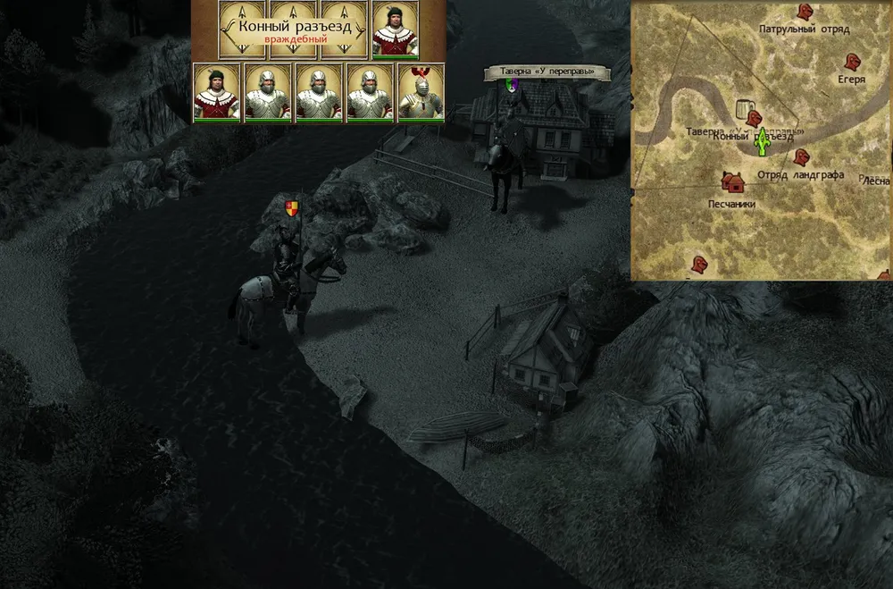 А затем проводник убедил-таки героя обогнуть заставу по лесной чаще. Что принесло неожиданную находку – с высоты холма, сквозь деревья, рыцарь разглядел на другом берегу реки здание, весьма похожее на харчевню. Если где-то есть наёмники – а они есть везде – то почти наверняка коротают время в питейном заведении. И, не обращая внимания на лепет проводника, герой выехал на дорогу, ведущую к броду.