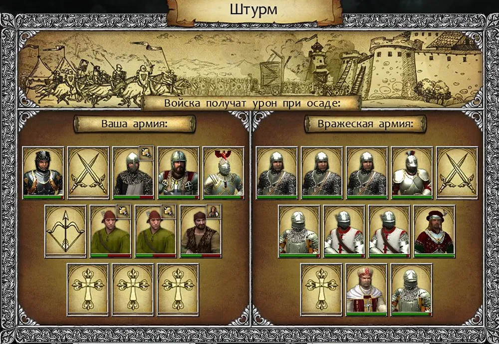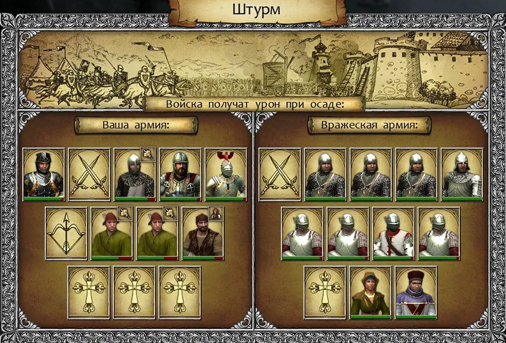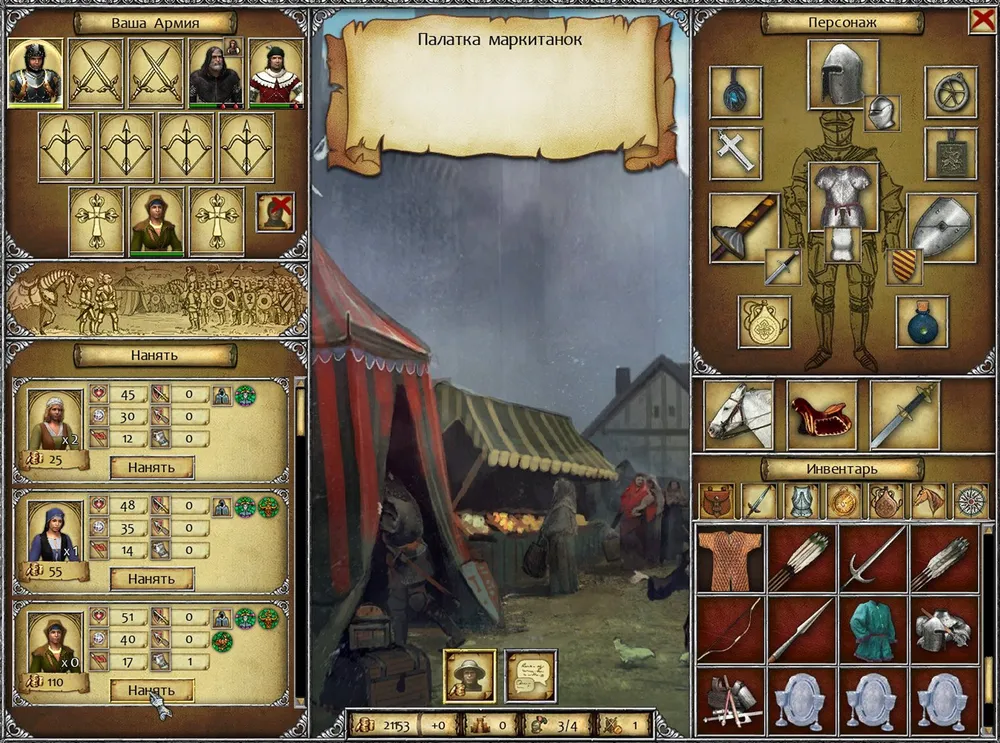 Ба, старый знакомый! К тому же не остаётся в стороне, а присоединяется к отряду. Почему бы теперь не заняться вражеским замком? Тем более, что золота покамест в избытке! Уязвимое место любой крепости – гарнизон; мало отбить вражескую твердыню, её ещё нужно удержать… Некоторое время рыцарь курсировал между палатками и замками своей стороны, пока не заполнил свой шатёр будущей охраной. К его удовольствию, за это время в палатке маркитанток появились врачевательницы. Совсем хорошо!