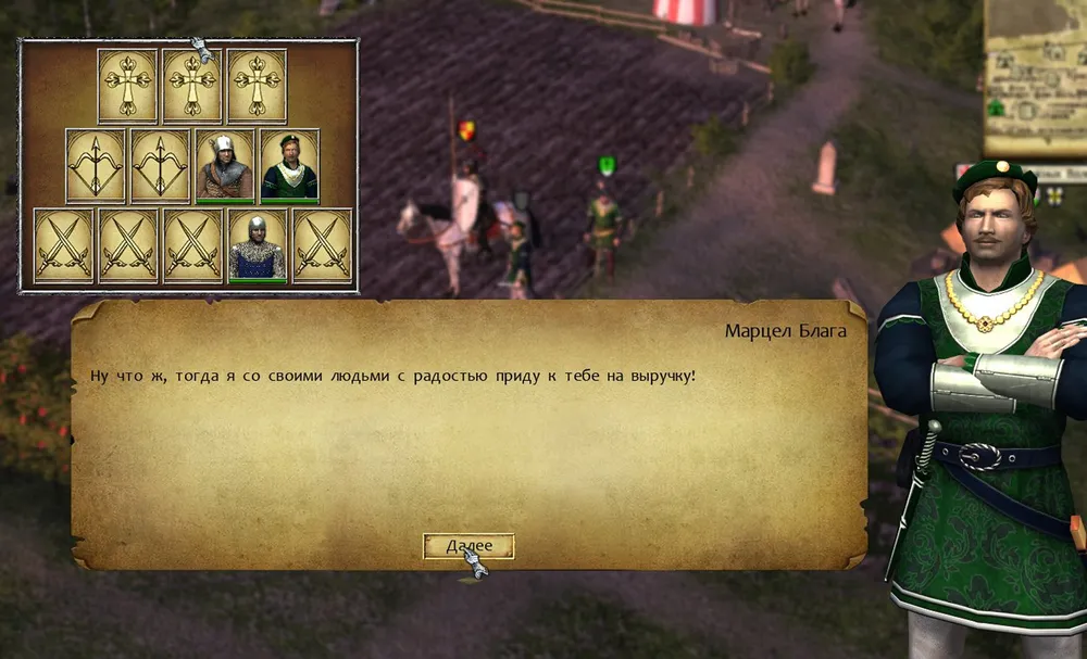 Оставалось узнать у Даниэля дорогу, и можно отправляться дальше. Но едва герой вступил в лагерь, как произошла ещё одна встреча: с предложением помощи к рыцарю присоединился Марцел Блага. Тот самый, которого обвиняли в отравлении жены, и которого сэр Найджел в своё время спас от крупных неприятностей.