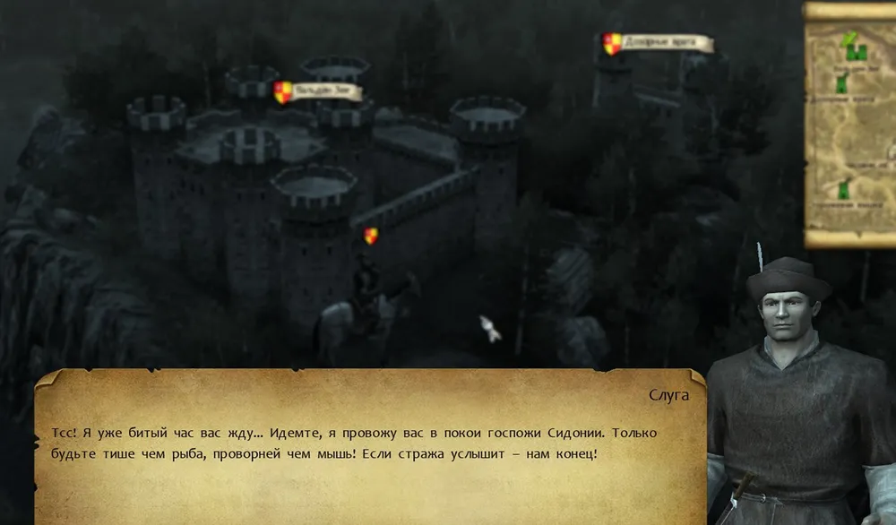 Выпущен голубь, наступил вечер, и герой с проводником стоят под стенами замка, причём последний лепечет: «Только бы не заметили стражники!» Забыл он, что ли, что замок уже захвачен? Обошли стены со стороны озера, из тени выступил слуга и тоже принялся нести чушь: «Берегитесь стражи!». Пьян он был, что ли, во время штурма? Или в подвале просидел? Впрочем, пусть говорит, что угодно, лишь бы дело делал…
