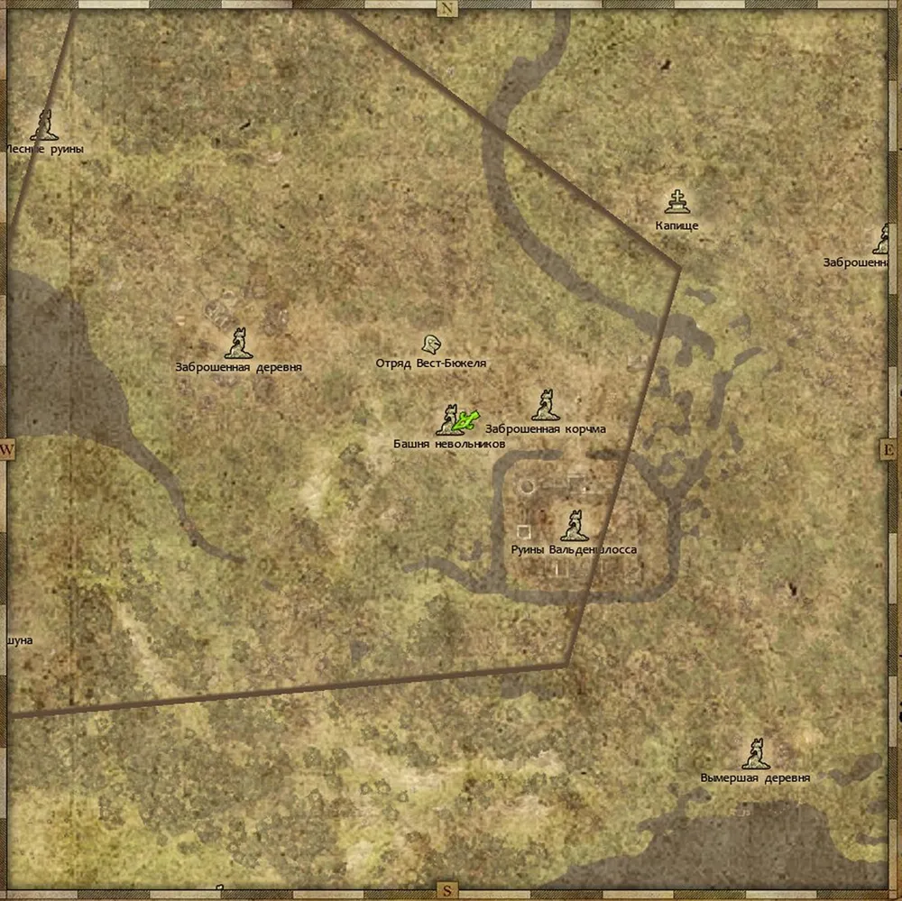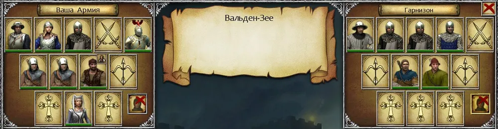 (Увы, план не удался – чересчур сильный отряд сидел за стенами.) Возвращаемся к таверне на берегу – наёмников можно забрать, не вступая в бои – и, если не получается взять Вальден – зее (атаковать не в лоб, а обходя сзади: ворота защищены, все будут ранены, придётся вернуться к часовне, а ночь закончится), штурмуем Грабштайн. Кстати, золота у нас такое количество, что наёмников можно оставить в отряде до момента появления гарнизона в замке. И тогда уже соединёнными усилиями наверняка удастся взять Вальден - зее.