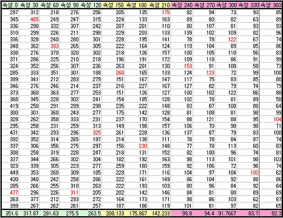 Каждая часть брони позволяет установить 60 единиц атрибута, мы изменяли атрибут на 30 единиц, используя баффы "Dance of Earth Guard" и напитки (Earth Attribute Liquor). Полученные значения урона заносились в таблицу в целях удобства сравнения. После проведения набора достаточного количества измерений мы увеличивали атрибут на 30 и повторяли опыт. Для удобства максимальные значения в каждом столбце отмечены красным. Значения полученных критических ударов исключены из вычислений.
