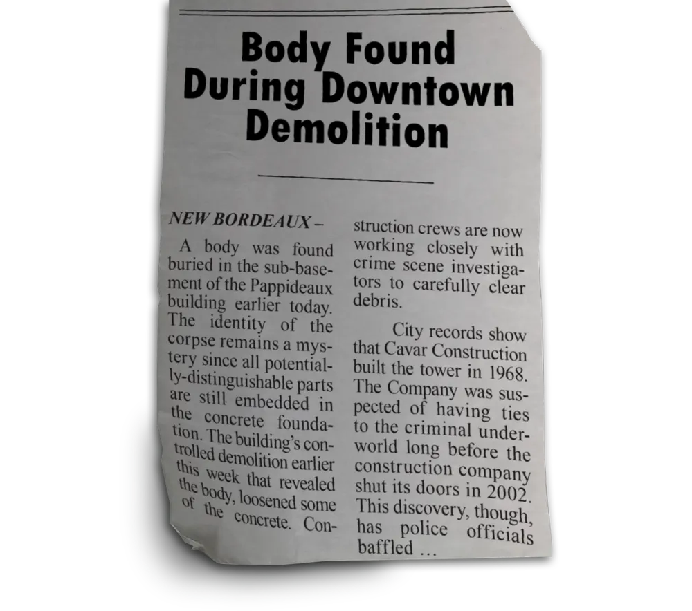 Вырезка из современной газеты о находке неопознанного тела после сноса здания в центре города. Здание возводила компания Cavar Construction в 1968 году, закрылась она в 2002 году.