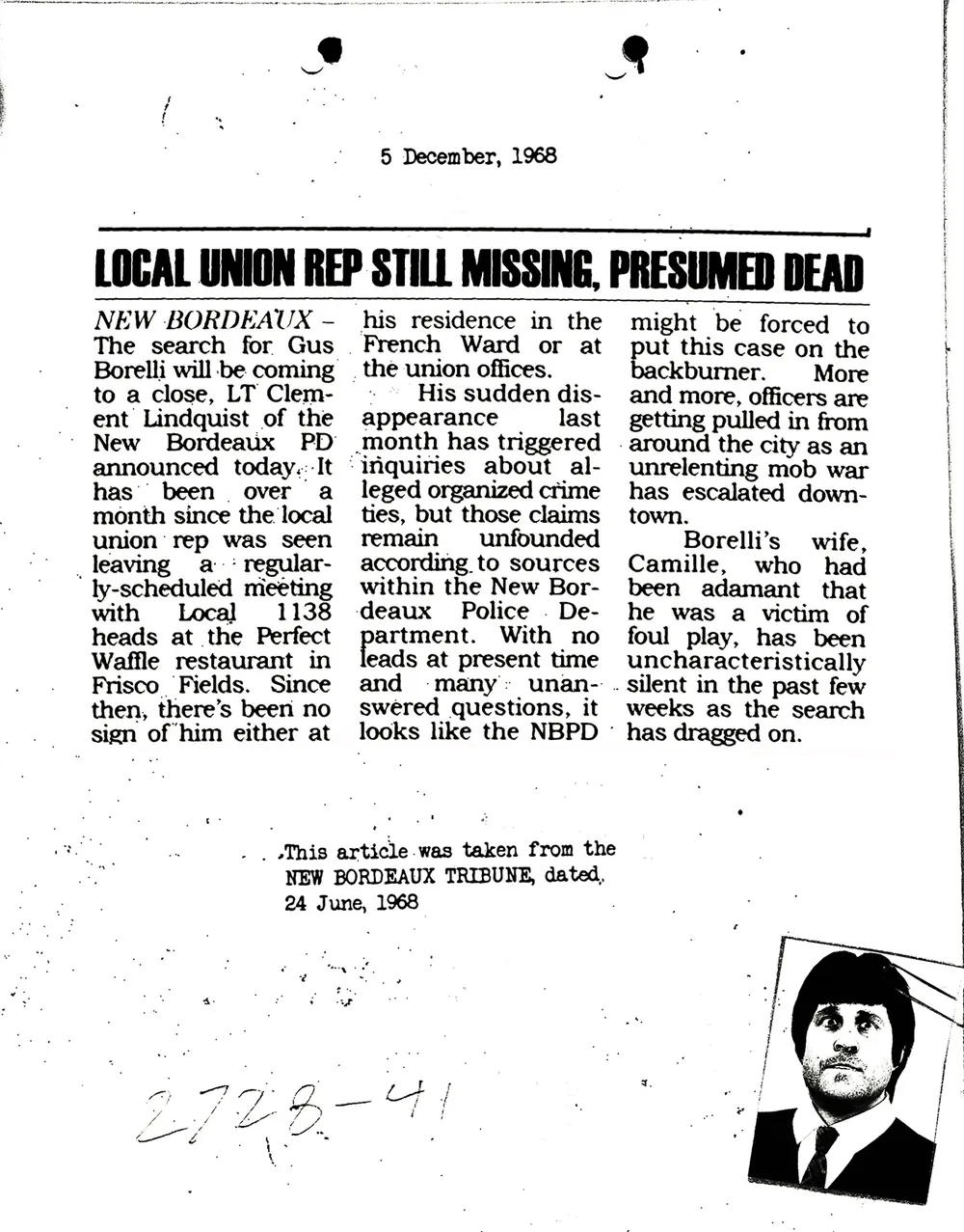 Вырезка из газеты 1968 года о пропаже профсоюзного лидера.