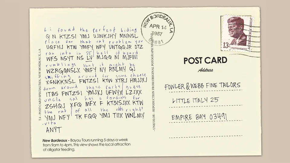 «L I FOUND THE PERFECT HIDING PLACE FOR THAT RAT PROBLEM YOU RAN INTO IN GQ HELL ID HEARD RUMBLINGS THAT IT MIGHT BE SNIFFING AROUND FOR SOME CHEESE DOWN AROUND THESE PARTS GUESS UNCLE SAL HAS A FONDNESS FOR THE RAT OF ALL THE ODDS RIGHT VITO».