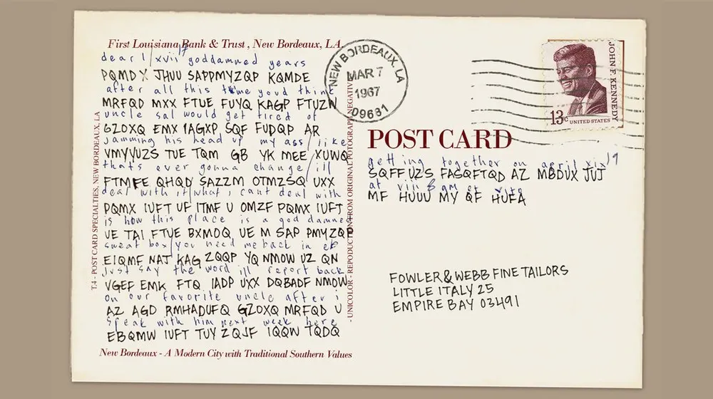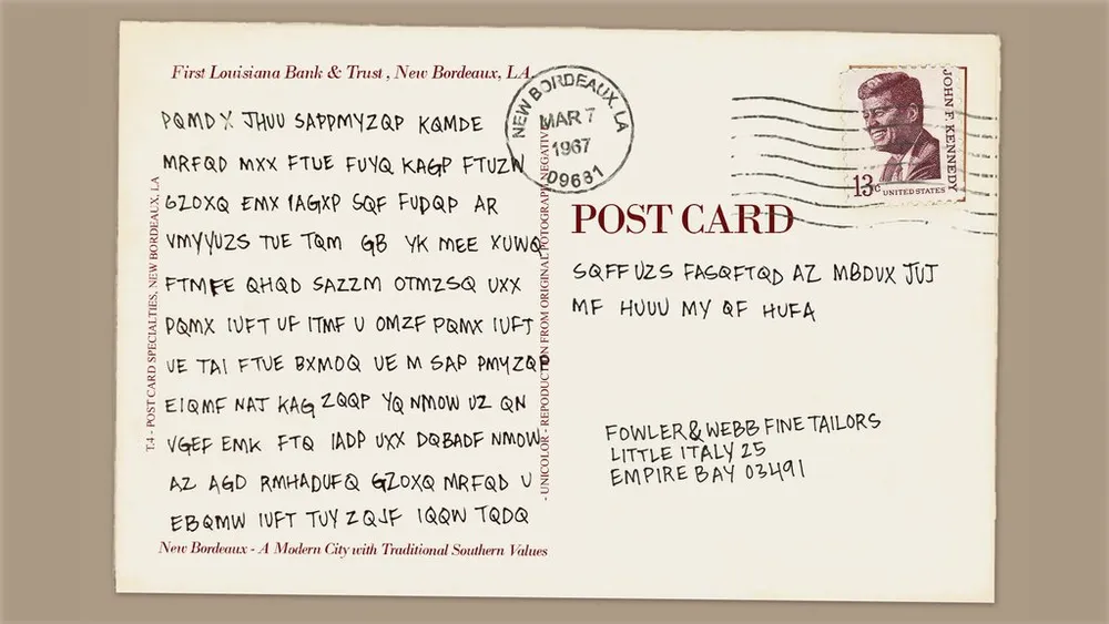 На оборотной стороне открытки – зашифрованный текст и адрес получателя в Эмпайр-Бэй.
