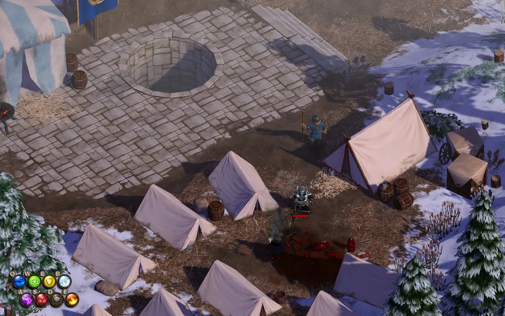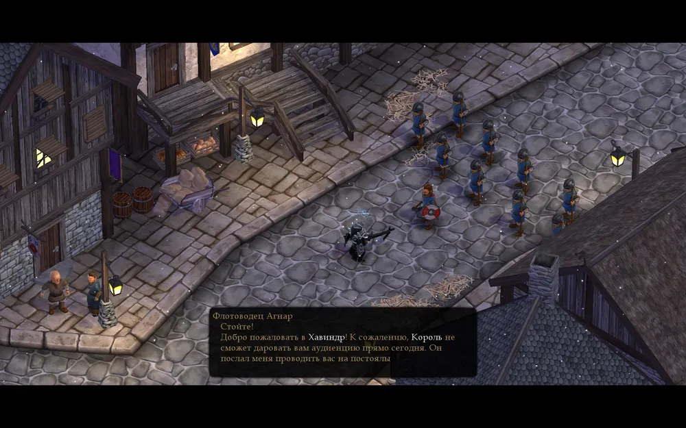 Падает с флотоводца Агнара и ещё одного капитана около фонтана.