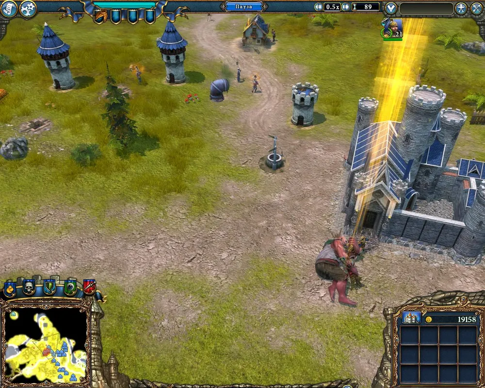 Выставляем скорость игры на 0,5. С помощью «Наговора камня» возводим на открытых местах храмы Дауроса, Агрелы и Хелии – троны элементалей исчезнут, элементали огня – тоже. А вот элементали молнии исчезать не желают, и способны доставить немало хлопот!