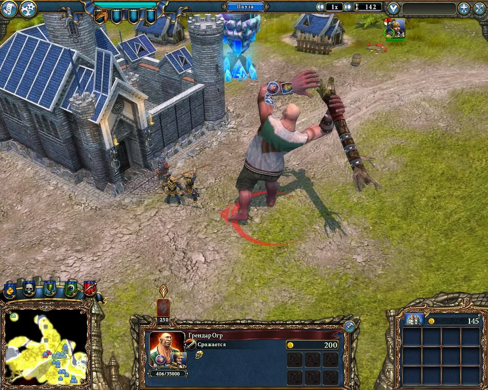 Улучшаем замок и начинаем тянуть цепочку второстепенных зданий вдоль восточной дороги, с целью открыть жилище отшельника. Таким же способом отыскиваем две пирамиды минотавров и три трона элементалей, разрушая их с помощью магических башен. (Чтобы не тратить слишком много золота, подождите, пока враги уничтожат здания из предыдущей «цепочки» - цена построек снизится.)