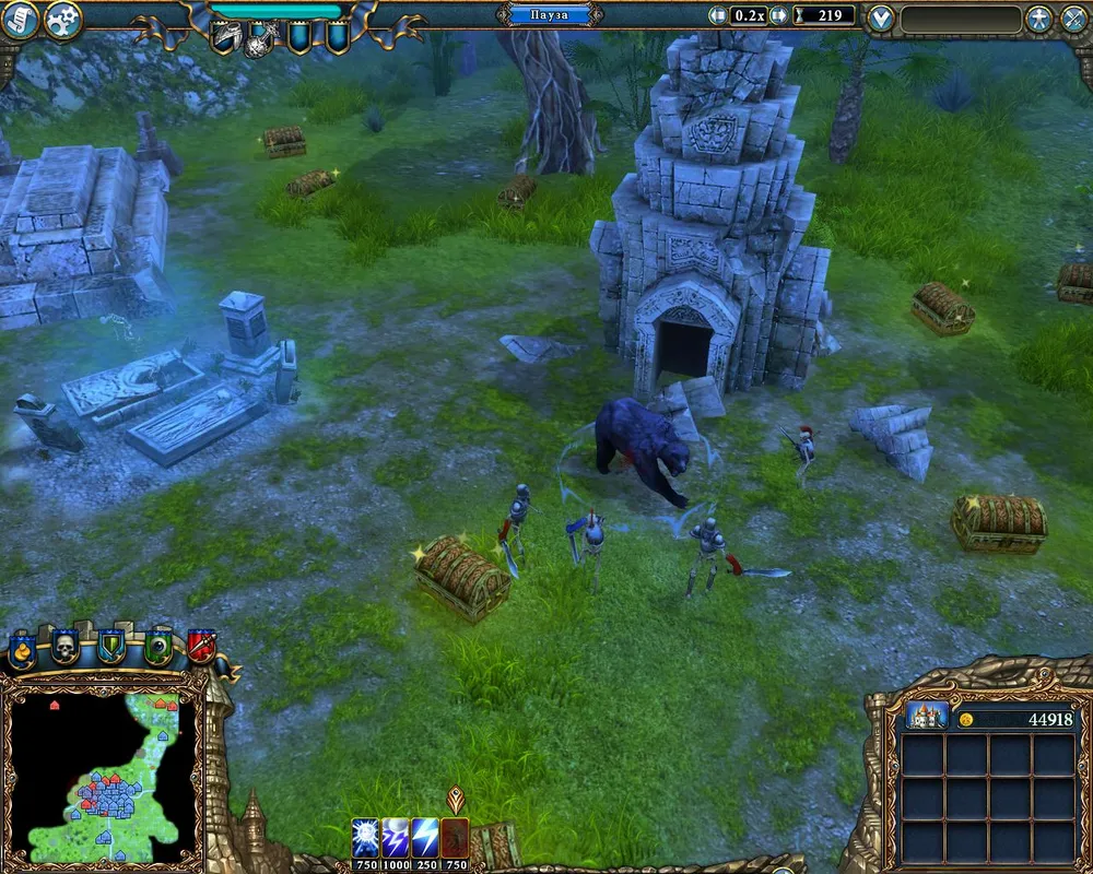 На востоке от замка строим рынок и кузницу – должен открыться торговый пост. Защищаем его охранной башней, которая разрушит ближайшее кладбище. Следующий этап – как можно скорее получить возможность строить башни гномов; их лучше всего возводить не вплотную к замку, а неподалёку от точек, в которых появляются порталы Тьмы. Улучшаем замок и рынок до третьего уровня и окружаем все здания кольцом защиты. На ближайшем доступном месте возводим храм Фервуса: его заклинание «Слово Фервуса» вызывает медведя Хаоса в любой скрытой точке карты. С помощью мишки ведём разведку – стоит поостеречься западного направления – и уничтожаем найденные кладбища и пирамиды минотавров магией. Обнаруженные зеркала тьмы легко уничтожаются несколькими «Штормами молний»; с помощью этого же заклинания разрушаются два кладбища в северо-восточном углу карты.