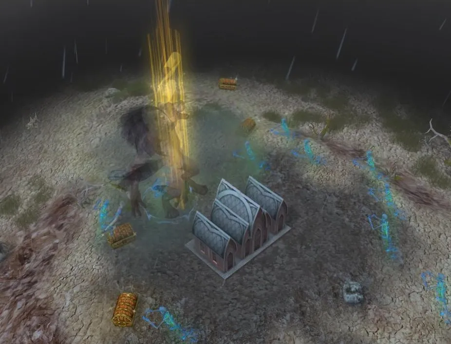 Пришедший в гости Король-скелет прежде всего ополчится на башню и не уйдёт от неё, пока не разрушит. В этот момент необходимо, используя «Наговор камня», построить у него за спиной ещё одну башню, но так, чтобы её огонь доставал до врага, а она находилась вне досягаемости атак. (Если удалось накопить более 50.000 золота, можно возвести и две башни.) Ремонтируем разрушаемую башню и ждём. Или – бьём по врагу молнией; всё зависит от количества накопленного золота.