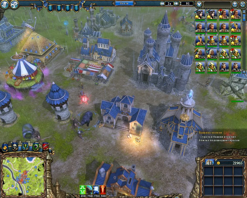 Всё это время стрелки будут атаковать наш город, увлечённо разрушая крестьянские домики и воинскую гильдию, но не трогая рынок и кузницу. О том, что совершили роковую ошибку, враги поймут, как только мы поставим первую гномью башню – уничтожить её они не смогут ни при каких обстоятельствах.