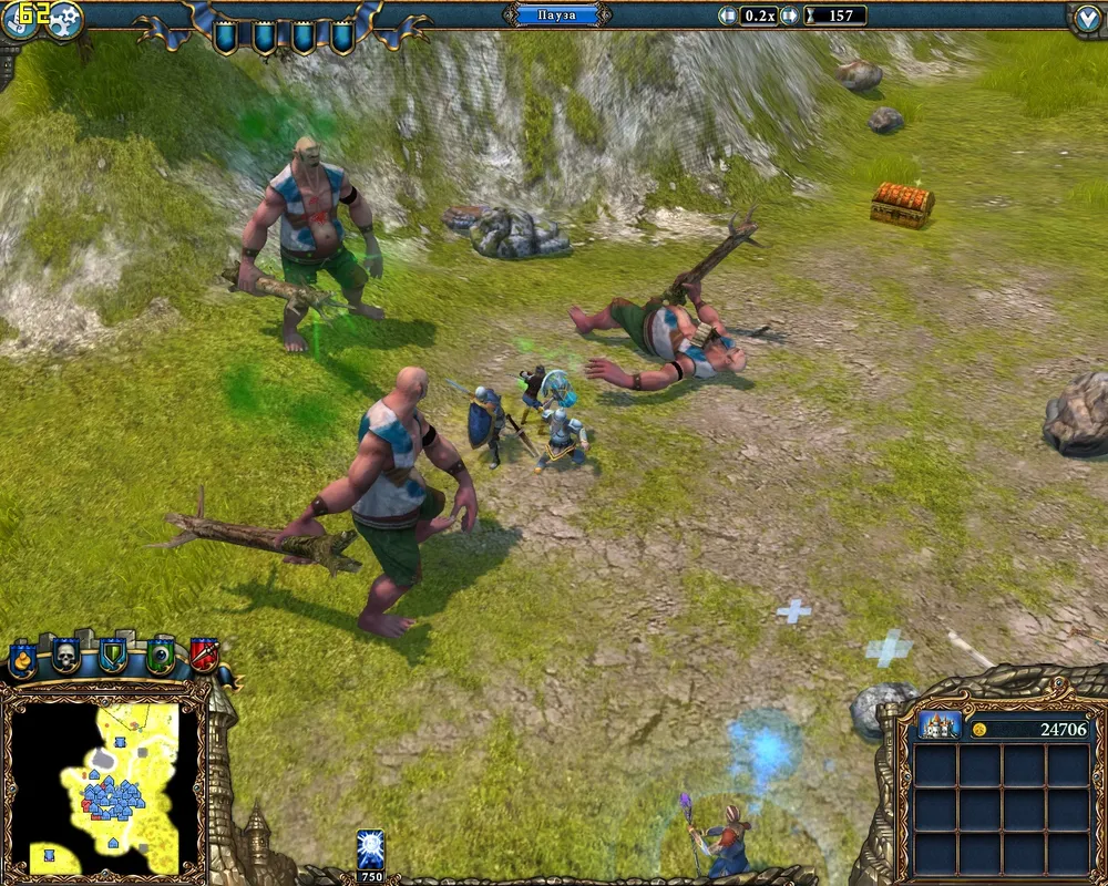 Главную опасность для нас на начальном этапе представляют огры, четыре пещеры которых находятся в юго-западном углу. Поэтому первым делом строим гильдии послушниц и разбойниц, находим и уничтожаем пещеры.