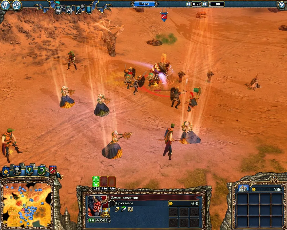 Демон-советник имеет одну особенность - его удары захватывают огромную площадь, действуя при этом на всё живое. И, если вы вступили с ним в бой неподалёку от замка - о прибыли золота можете забыть, все сборщики налогов и торговые караваны будут гибнуть, даже не появившись в поле зрения.