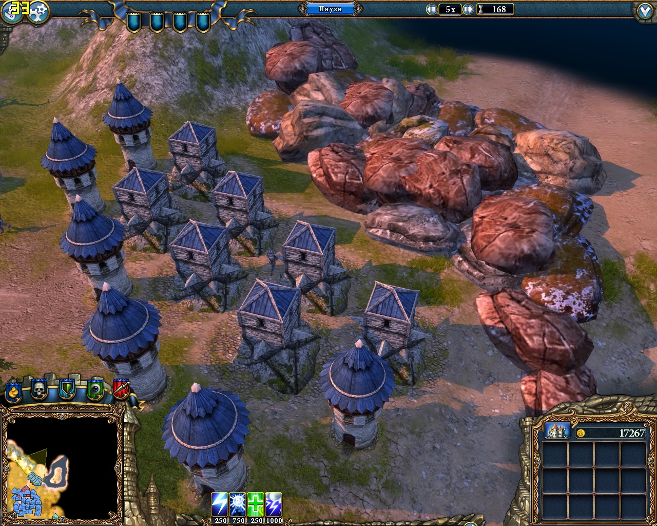Чуть позже зловредный гоблинский шаман откроет на территории города два или три портала, из которых повалят огры. Постарайтесь сделать так, чтобы рядом с замком к этому моменту не было свободного места – тогда порталы откроются за границей города. Или же прикройте все свободные места башнями.